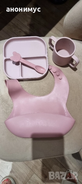 Лигавник,лъжица,чаша, чинийка,много високо качество. ползвани много малко. подарък силиконова лъжица.