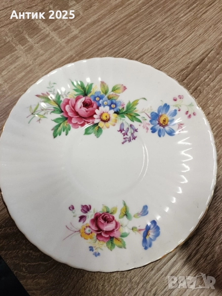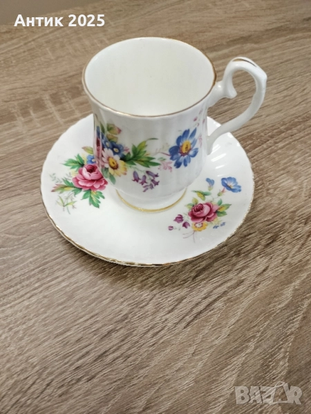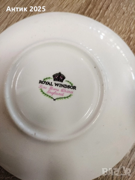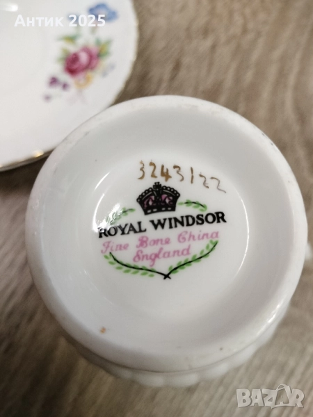 Оригинален английски порцелан от серията Royal Windsor. Изработен от фин костен порцелан, украсен с цветен флорален мотив и златен кант. Маркировка на дъното: Royal Windsor Fine Bone China England и номер на декора – 3243122. В отлично състояние – без пукнатини и отчупвания. Подходяща за колекция или елегантен подарък.