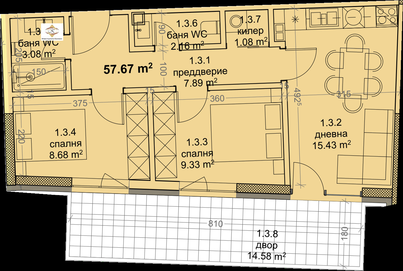 Апартамент A.1.3 е тристаен, разположен е на първия етаж в сграда 'АЛФА'. Състои се от преддверие, дневен тракт, две спални, две бани, килер и тераса -двор.