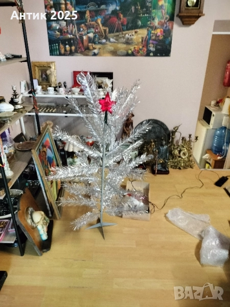 изкуствена елха в сребрист цвят, в оригиналната си кутия. Пълен комплект: метален/пластмасов ствол, клони от мишура, връх и стойка. ✨ Характеристики: Производство: СССР Сребристи клони от плътна мишура Лека, компактна и лесна за сглобяване В оригинална опаковка с надпис „Елка декоративная“ Състоянието е отлично за възрастта си, всички части са налични. Подходяща за ретро коледна украса или за колекционери.