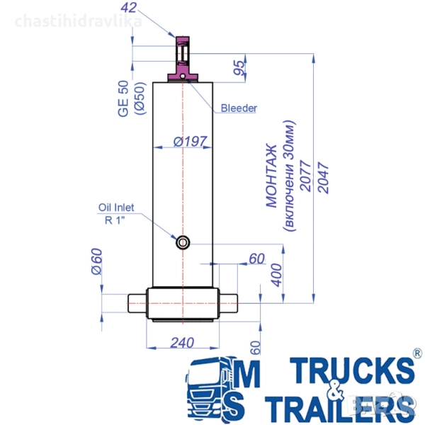 За монтирането на този Хидравличен цилиндър са необходими допълнителни елементи - горна стойка (47000026) и долен комплект стойки (47000017), които се заплащат отделно.