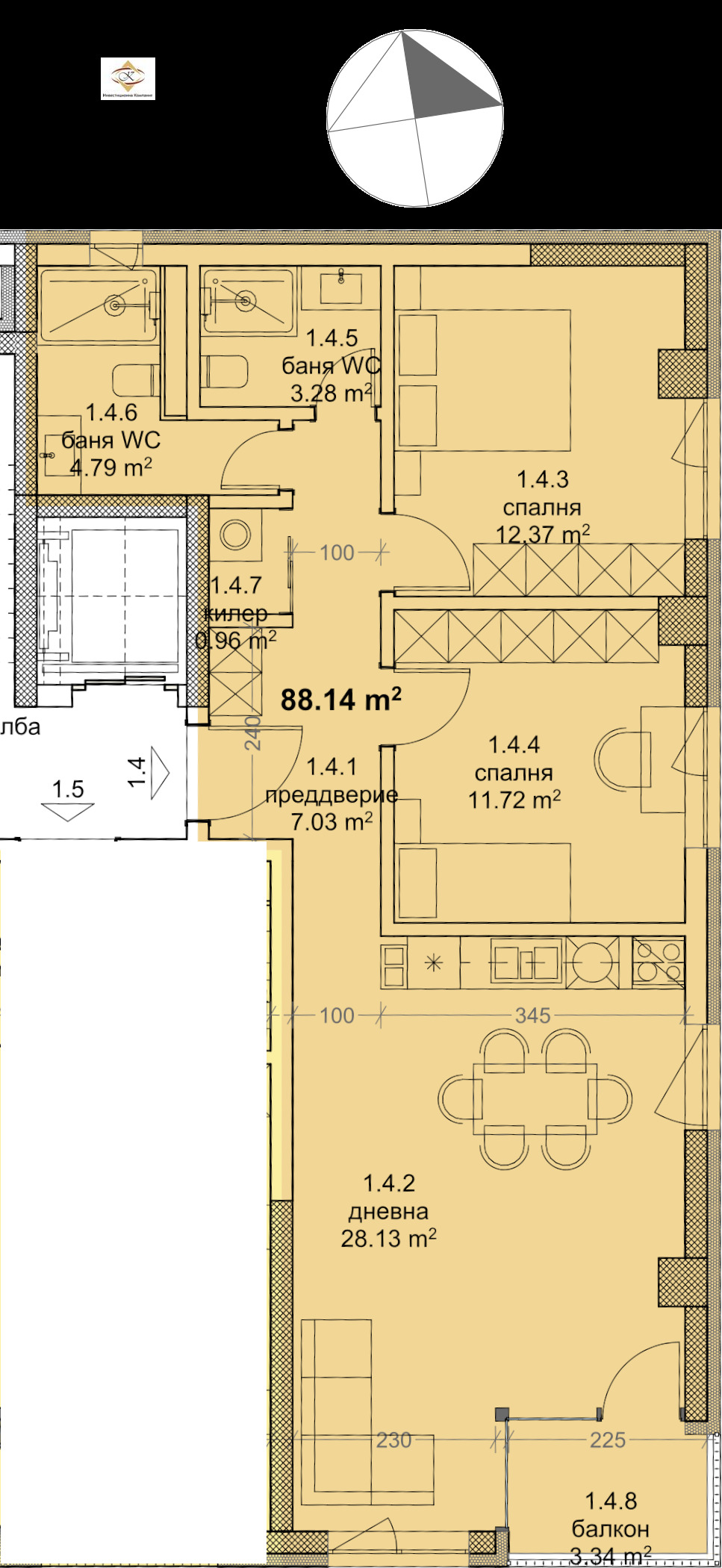 Апартамент A.1.4 е тристаен, разположен е на втория етаж в сграда 'АЛФА'. Състои се от преддверие, дневен тракт, две спални, две бани с тоалетни, килер и тераса.