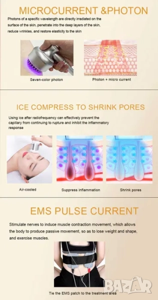 Когато използвате триполюсната радиочестотна глава, нанесете само за 15-20 минути с основно спираловидно движение върху тялото.