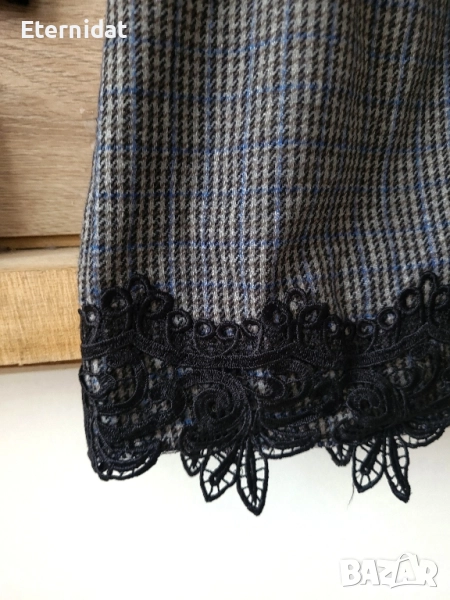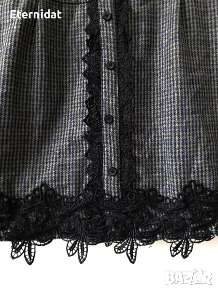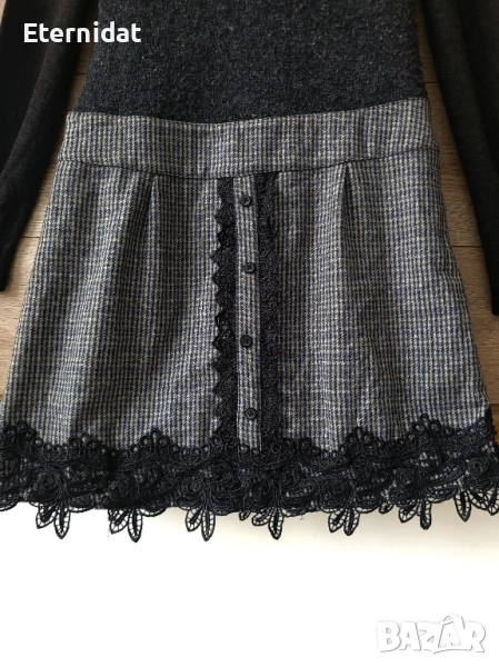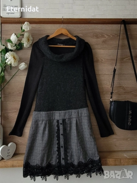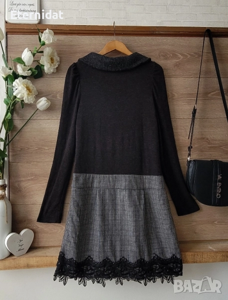 Стилна зимна рокля DOPHYLINE. Топла, стилна , за офис стил. Горна част от еластично плетиво , полата от вълнена материя с допълнителна подплата отдолу. Обкрайчена с дантела и копчета. Стои страхотно с ботуши или боти. За елегантна стилна визия! Размер по етикет Л/ХЛ Дълга 90см, в гръдната е силно еластична и съответно варира от 96 до 108см . В талията ( там където е колана) е 45см ( едностранно). Цена 55лв