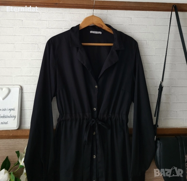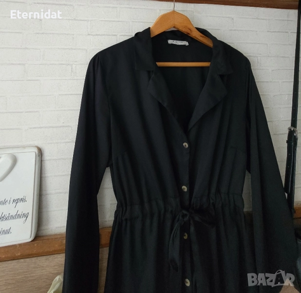 Черна рокля тип риза с пристягащо коланче в талията на марката PIECES. Размер по етикет ХЛ, но е перфектна и за Л. Гръдна 106см, дължина 111см. Цена 42лв