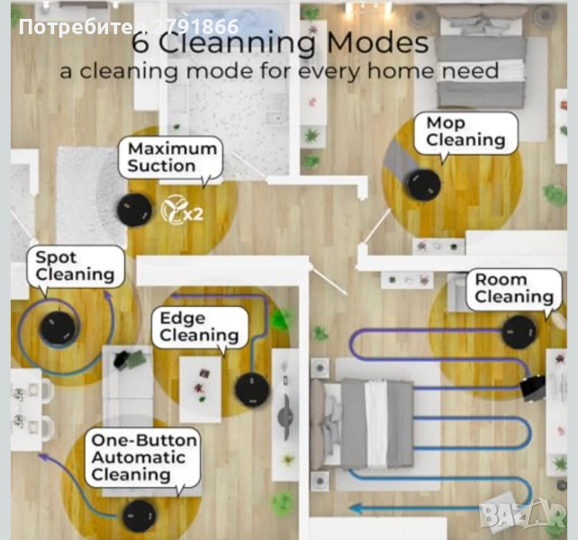 - 6 режима на почистване: Автоматично, Локализирано почистване за особено замърсени места, Периметърно почистване за обхождане на стени, Почистване по стаи за изпълнение на всички програми в отделно помещение, Почистваща машина за подове и Максимално засмукване за 2 пъти по-голяма мощност. С функция за ежедневно планиране на почистването. Подходящ за всички видове подови настилки: паркет, плочки, килими с капацитет на изкачване от 3/4"