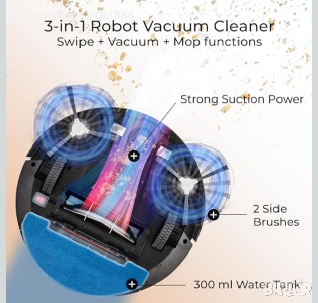 - Роботизирана прахосмукачка 3 в 1: Функция метла благодарение на 2-те си странични четки и голямата централна четка. Функция прахосмукачка с всмукателна мощност до 1600 Pa макс. Функция за почистване на под с голям резервоар от 300 мл. Мощна батерия 2600 mhA за максимална всмукателна мощност до 120 мин и 60 мин.