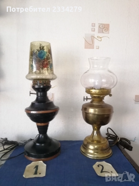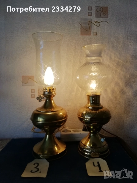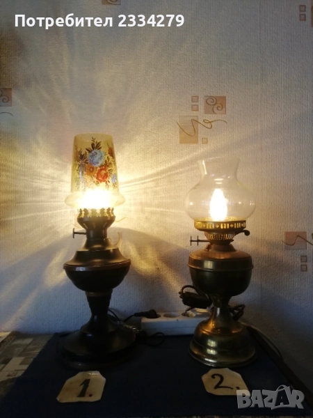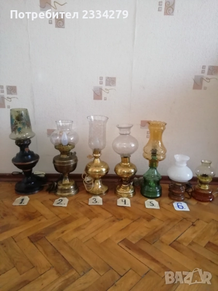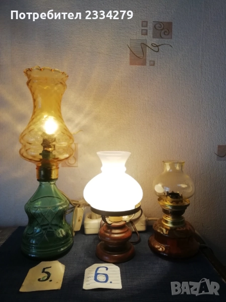 нощни лампи различни модели, години и държави. N:1 стара медна лампа, тип газена, орнаментирано стъкло, размери 46х16см., цена 17€.; N:2 стара бронзова настолна лампа тип газена, английска размер 41х15см., цена 27€.; N:3стара лампа месингова, тип газена, стъкло, размер 43х14см., цена 40лв.; N:4 месингова стара лампа със стъкло, размери 39х13см.; N:5 италианска нощна лампа сувенирно шише с вино и отгоре тапа с нощна лампа, размери 38х13см., цена11€. ; N:6 малка лампа от дърво, стъкло, Германия, размери 25х13см., цена 11€.; N:7 тип газена лампа, стъкло, бронз, размери 21х12см., цена 13€. всички работещи.