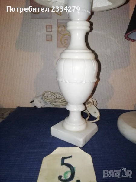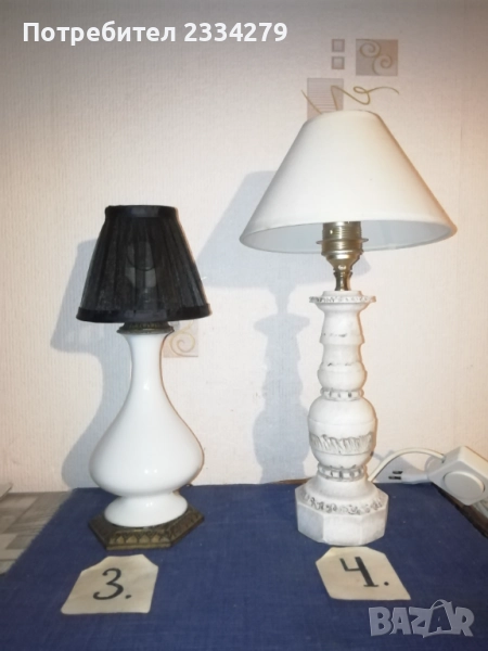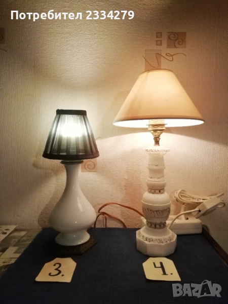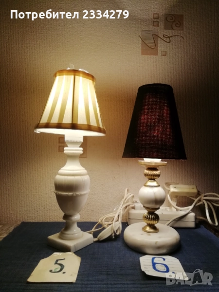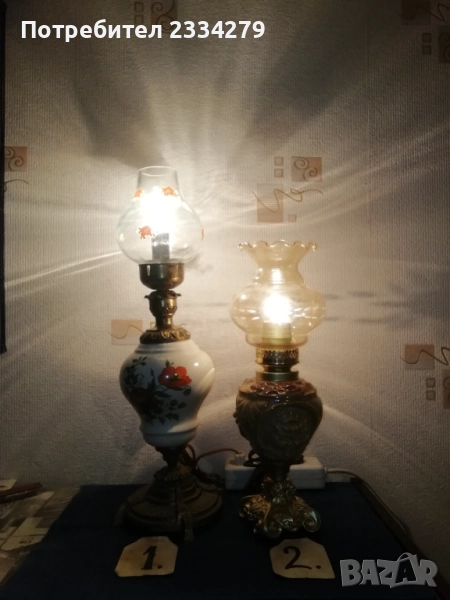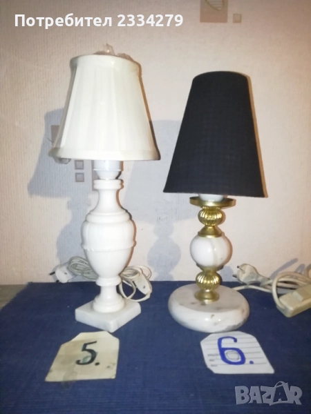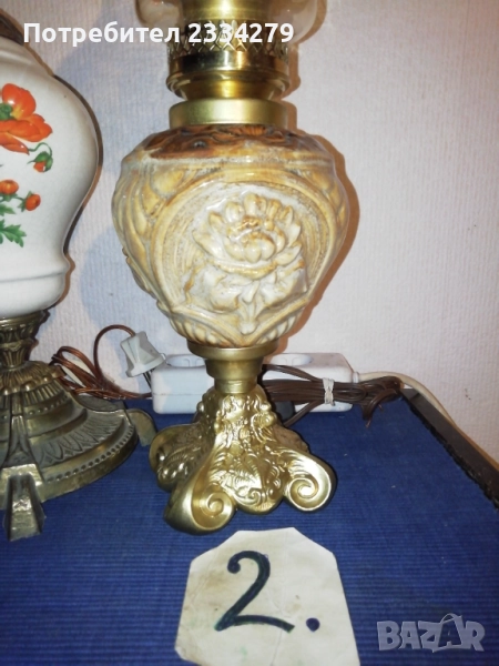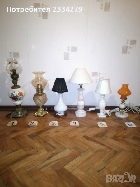 порцеланови лампи. N:1 стара лампа настолна, изработена от фаянс и бронз, орнаментирана размери 53х20см., цена 70лв.; N:2 порцеланова лампа тип газена, размери 40х15см., порцелан, бронз стъкло орнаментирани, цена 60лв.; N:3 стара нощна лампа, бронз стъкло, купол от плат, размери 35х1см., цена 20лв.; N:4 стара мраморна лампа с купол от плат, размери 42х22см.,цена 35лв.; N:5 мраморна лампа орнаментирана, размери 35х14см., цена 30лв.; N:6 лампа изработена от мрамор, стъкло, размери 30х13см., цена 17лв.