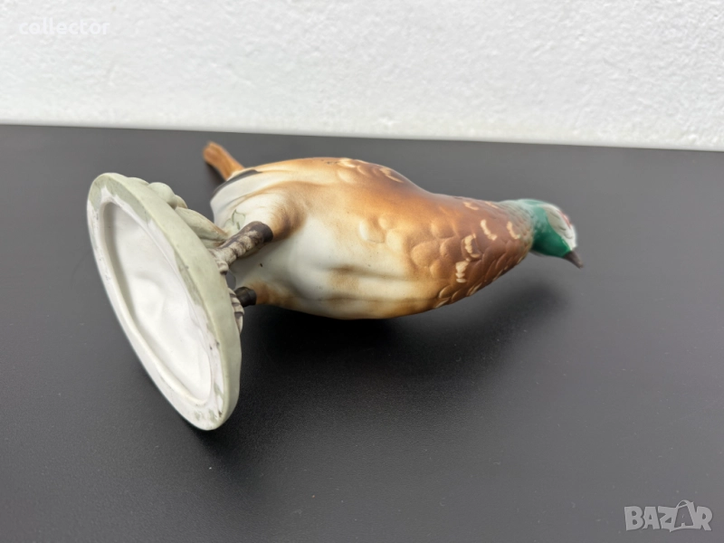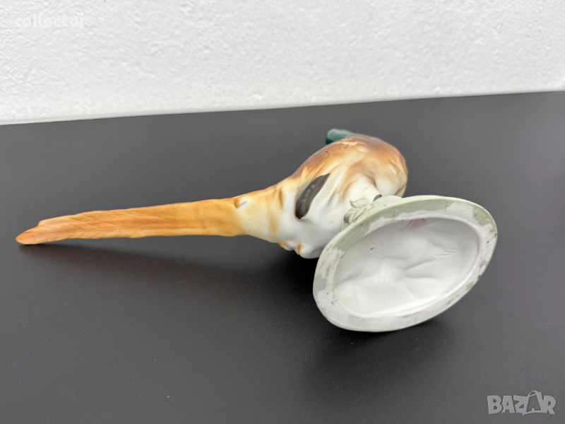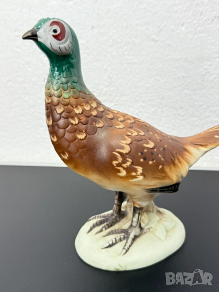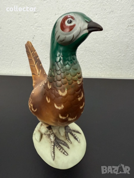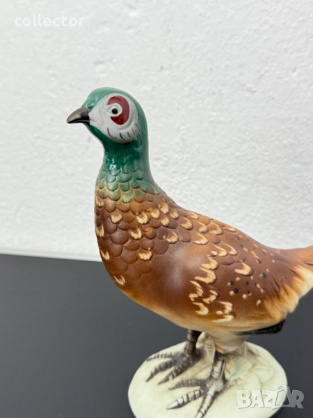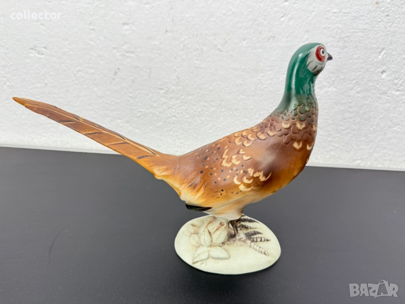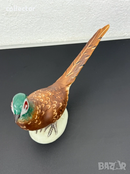 Това е порцеланова скулптура на фазан, произведена от Royal Dux през средата на 20-ти век. Фигурката е ръчно рисувана с детайли, които имитират оперението на птицата. Фазанът е изобразен в изправена поза върху бяла овална основа.
