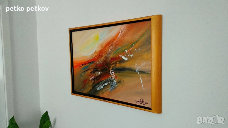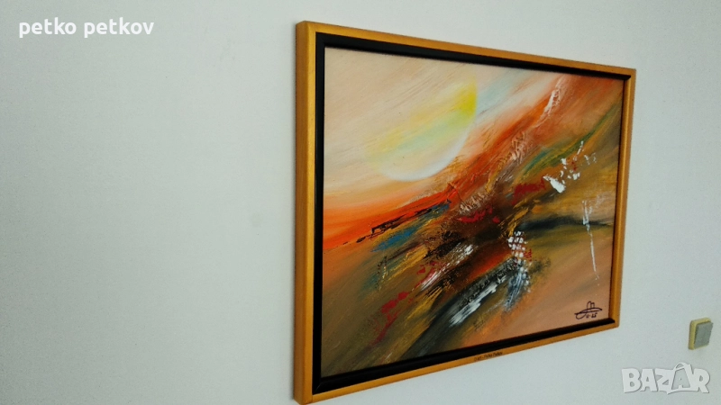 Акрил върху платно с подрамка. Собствено производство дървена рамка-уникат. Цвят на рамката - "златен" и черен гланц. Размери с рамката - 76/53 см.