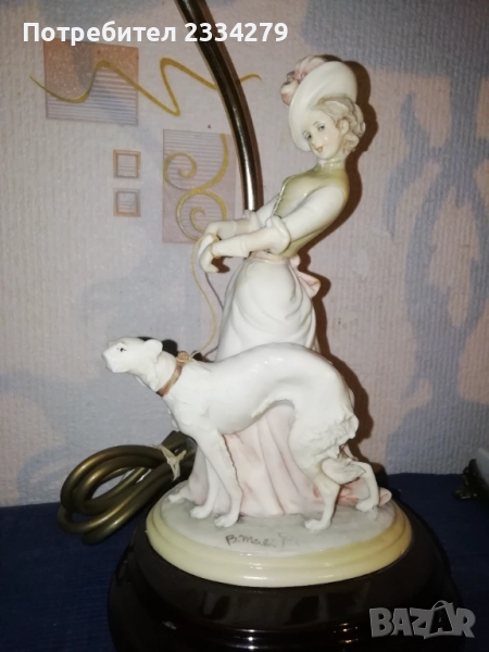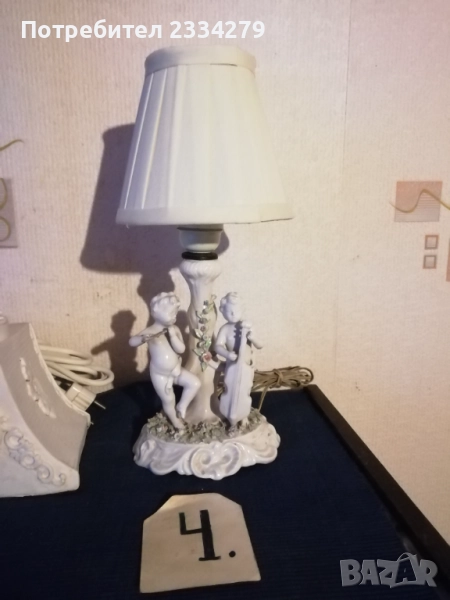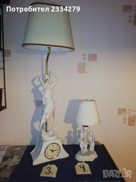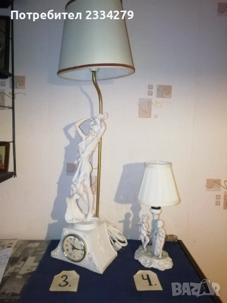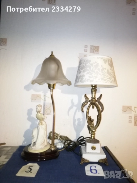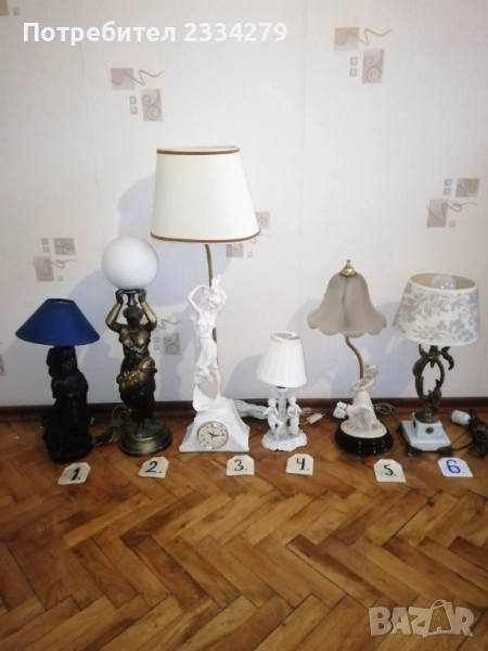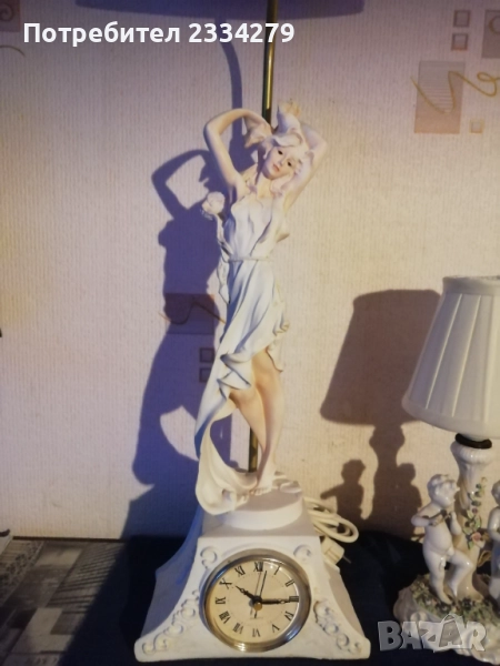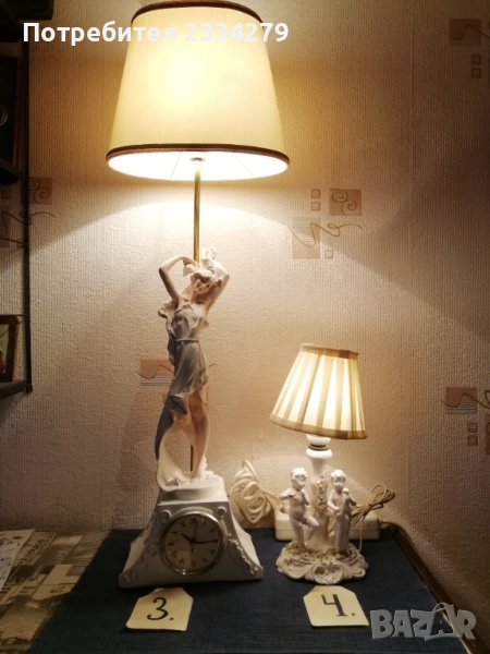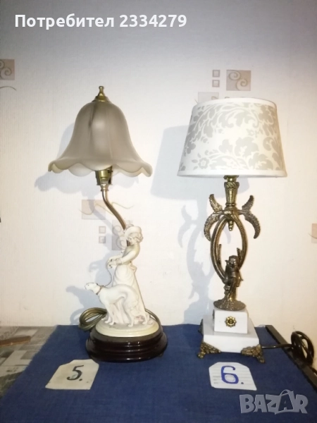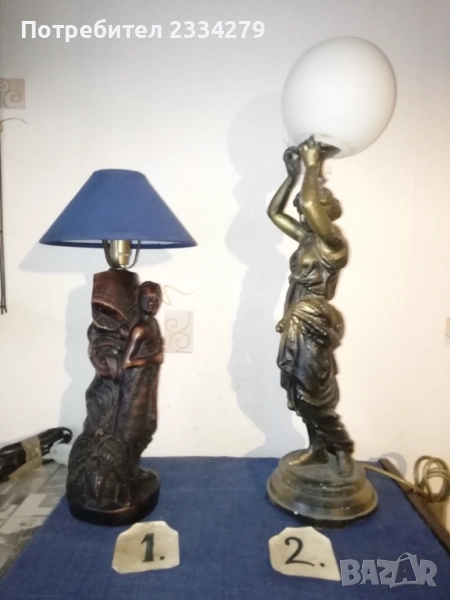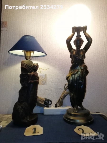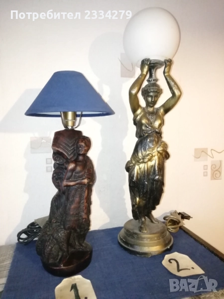 Стари настолни лампи фигури-статуи изработени в различни европейски държави и ателиета в различни години. N:1 нощна настолна лампа статуя на мъж в ,,латино американец" ръчна изработка от масивна твърда смола-алабастър, размери 47х37см., цена 40лв.; N:2 настолна авторска лампа стил TIFFANY ,,Жена с вдигнати ръце, РИМСКА аристократка", ръчно изработена отливка от метална сплав, размери 60х15см., цена 70лв.; N:3 статуя, лампа, часовник изобразяваща,,Ренесансова дама" масивна отливка от алабастър, размери 85х27см., цена 80лв.; N:4 настолна лампа ,,АНГЕЛИ МУЗИКАНТИ", размери 35х15см., цена 40лв.; N:5 ,,ДАМАТА С КУЧЕ" стара