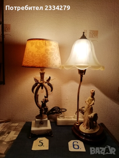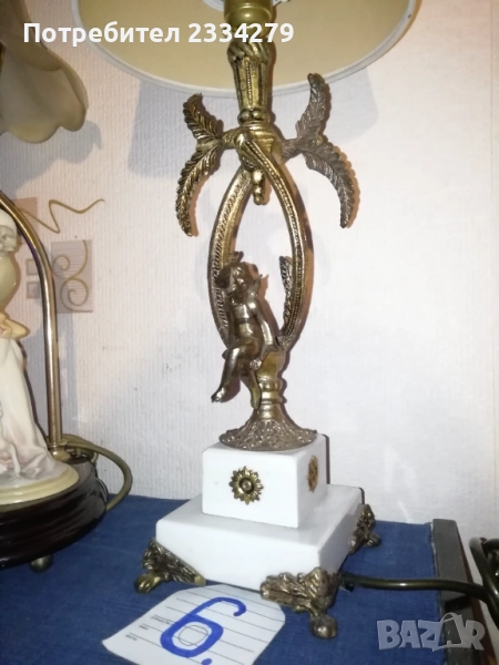 нощна лампа флоренциален стил, изработка от стъкло, метал, алабастър, дърво, метална фасунка със бутон за разсветване има и автограф и инициали на автора, размери 53х20см., цена 80лв.; N:6 настолна лампа,,ВЕНЕЦИАНСКИ АНГЕЛ" изработка от месинг, мрамор, плат и бронзови орнаменти, размери 47х20см., цена 50лв.