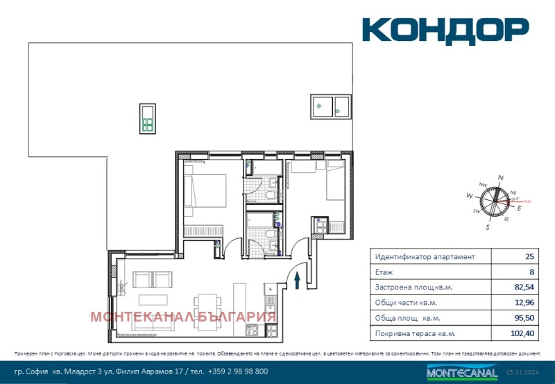 С РАЗРЕШЕНИЕ ЗА ПОЛЗВАНЕ. ОТ ДОКАЗАН ИНВЕСТИТОР. Монтеканал предлага тристаен апартамент, разположен в непосредствена близост до парка, община Младост и 25то ДКЦ. (на мястото на предишният търговски център Кондор), със застроена площ 82,54 кв.м. прилежащи общи части 16,01 кв.м., покривна тераса 102,40 кв.м.