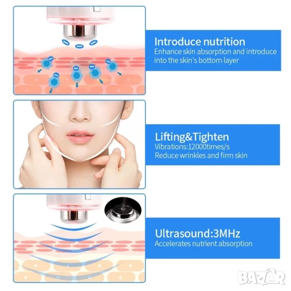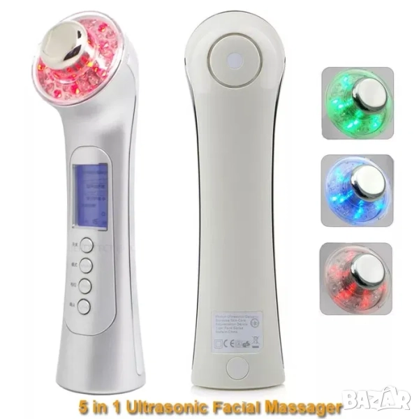 Козметичен уред с ултразвук, галваничен ток, LED светлина (червен, син и зелен спектър) и масажна вибрация