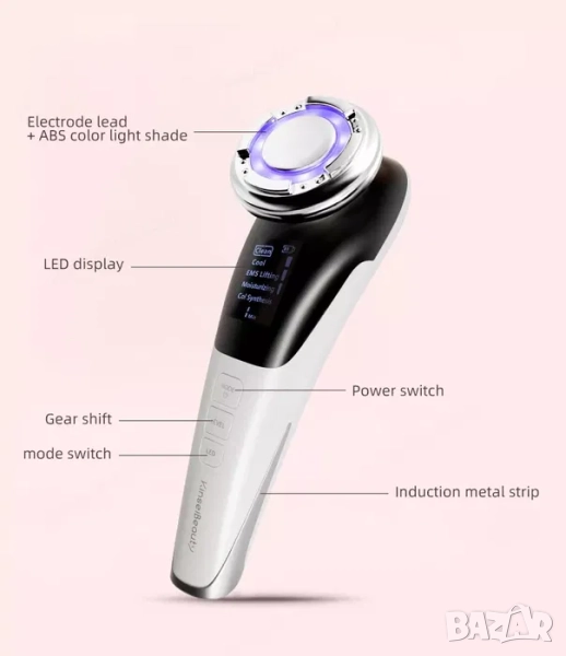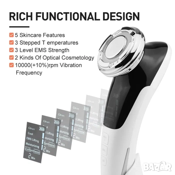 Мултифункционален уред за красота 6 в 1, включващ режими: почистване чрез вибро-акустична терапевтична функция, криотерапия, електро-мускулна стимулация (EMS), подхранващ/хидратиращ режим, леден колагенов синтез, синя и червена фотон терапии. Успешно редуцира мастни натрупвания, бръчки, пигментация, акне, зачервявания, свива порите, дава лифтинг ефект и изравнява тена на кожата. Повишава резултатите и ефективността при вкарване на различни козметични продукти в дълбочина.