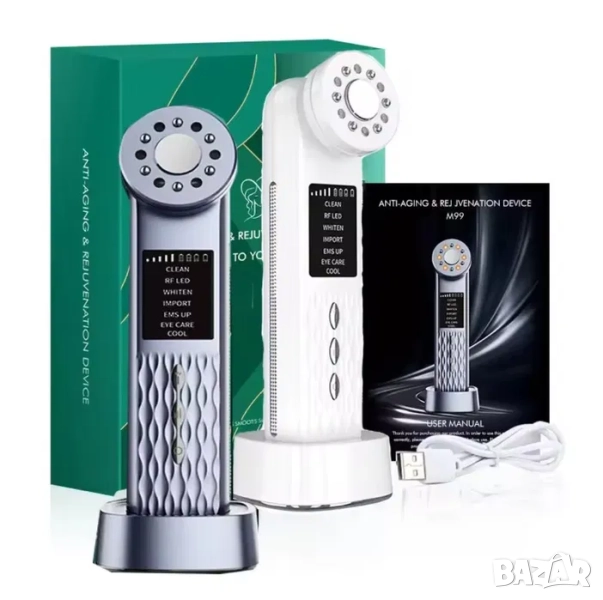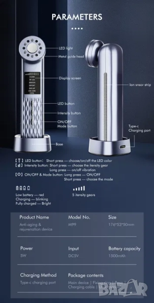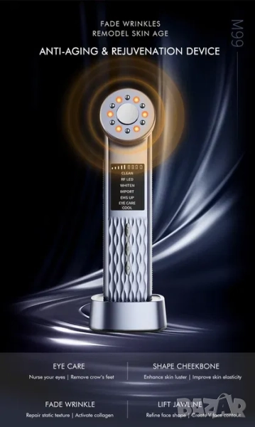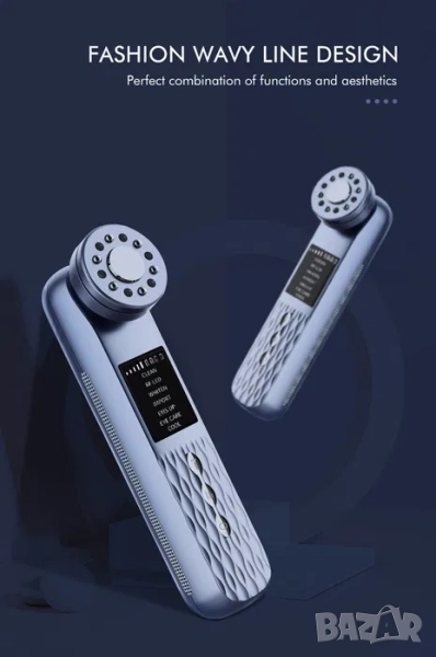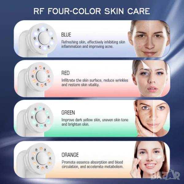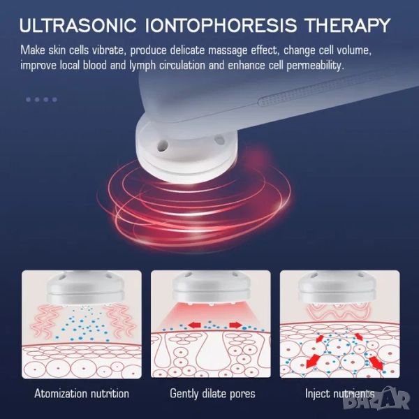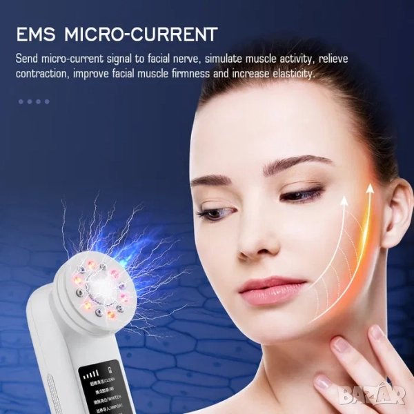 Този козметичен уред с ултразвук и студен компрес е предназначен за дълбоко почистване, ревитализация на кожата и контуриране на лицето, комбинирайки положителен и отрицателен EMS микрометричен ултразвук, вибрации и червени/зелени/сини/оранжеви RF светлини, заедно със студен компрес.
