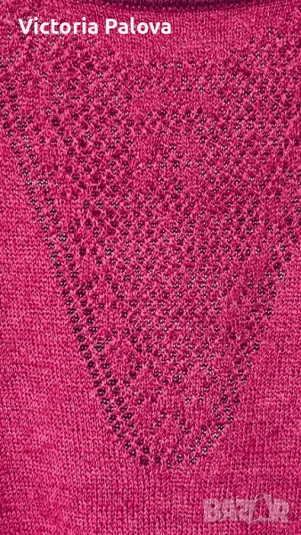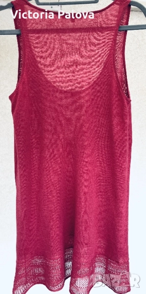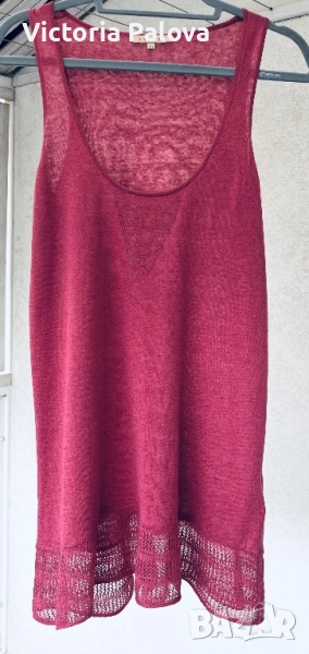 Потникът е истински шедьовър на елегантността на френския стил. Нежен цвят светла малина, изискано V-образно деколте добавят грация и лекота, ажурните детайли в долния край - ефирна женственост. Изработен от смес 53% лен и 47% памук , осигурява дишащ комфот и мекота. ГО - 40-44см, дължина - 80см.