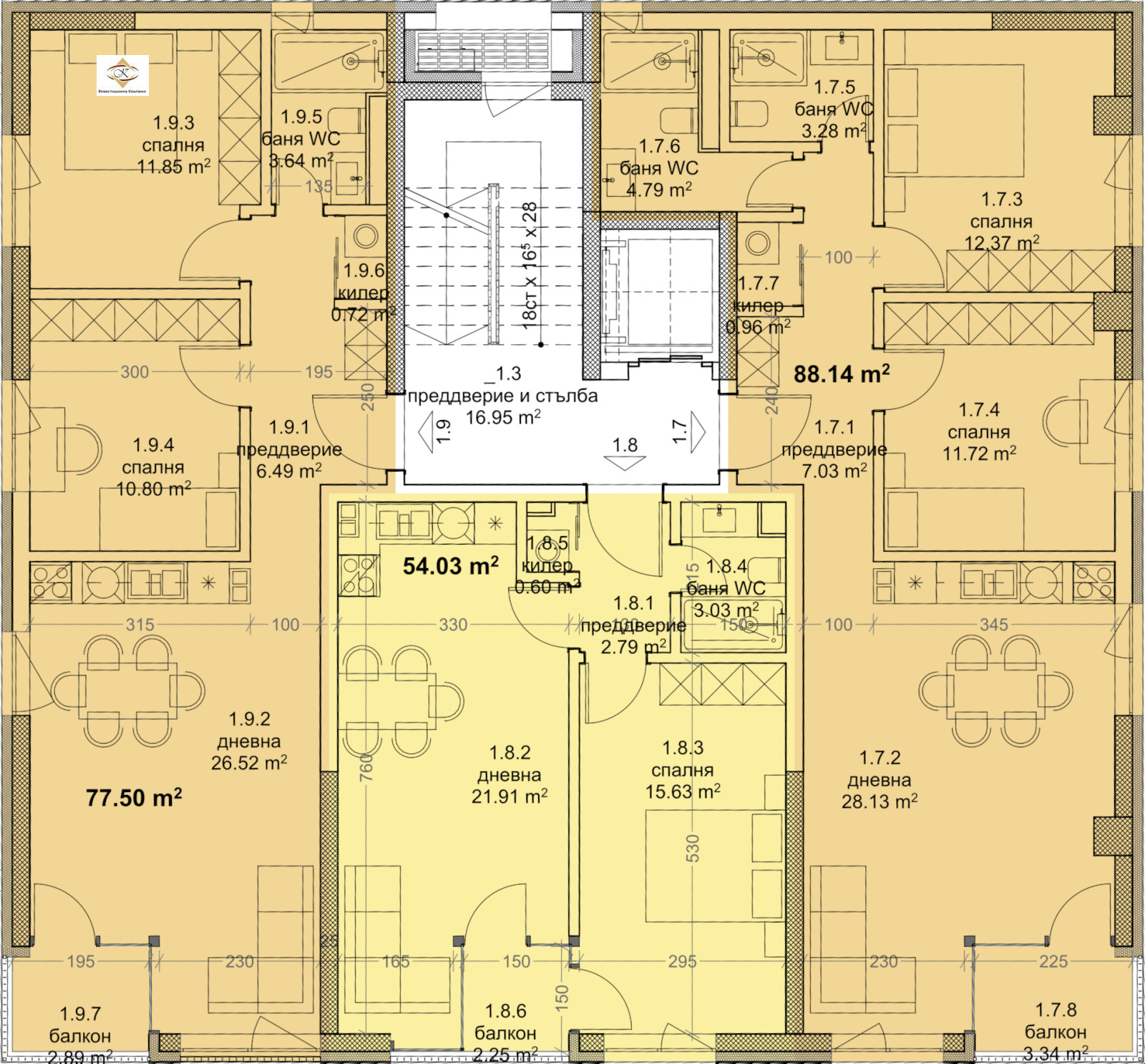 Апартаменти A.1.9 / и 1.12/ са типови тристайни жилища, разположени са съответно на третия / четвъртия етаж в сграда 'АЛФА'. Състоят се от преддверие, дневен тракт, спалня, две баня-тоалет, килер и тераса.