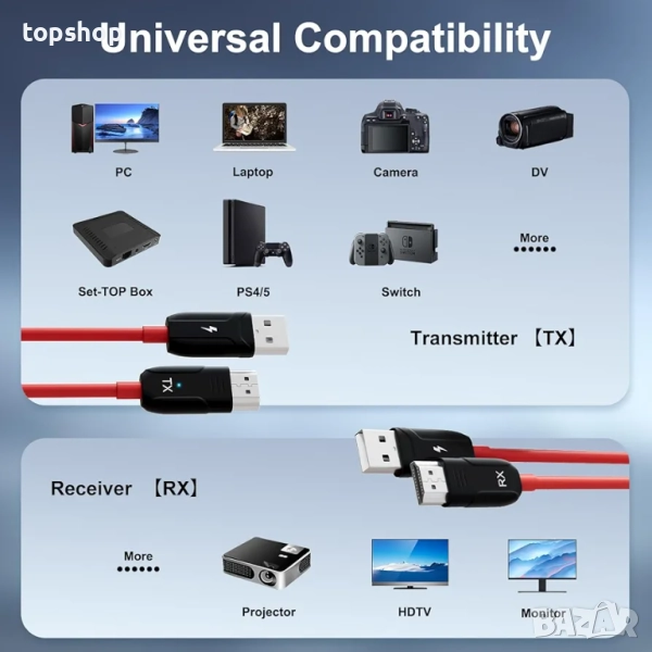 【Широка гама от приложения】 Безжичният HDMI предавател и приемник са съвместими с повечето HDMI устройства. Независимо от вида устройства и системи, които потребителите използват, стига да поддържат HDMI на един и същ екран, те могат лесно да предават поточно видео и аудио безжично към голям дисплей. Съвместим с лаптопи, настолни компютри, цифрови видеорекордери, DVD плейъри, HD видеокамери, игрови конзоли и дисплейни устройства, включително телевизори, монитори, проектори и други.