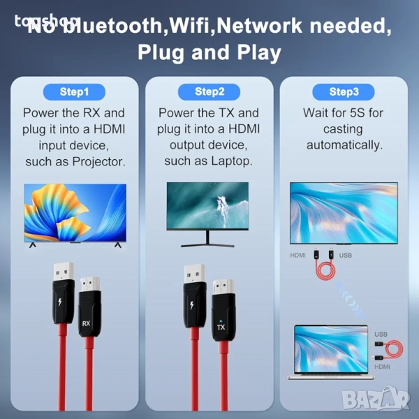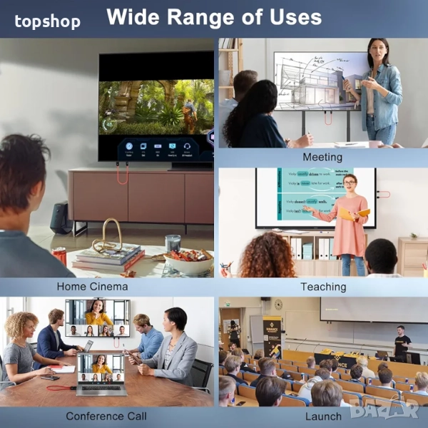 【 Не се изисква приложение, Plug and Play】 Безжичен HDMI предавател и приемник. Без драйвери, без Bluetooth, без Wifi. Plug and Play, бързо стартиране за 10 секунди, насладете се на истинско plug and play изживяване. Решава проблемите на традиционната HDMI кабелна връзка, засягащи естетиката и късото разстояние на предаване, а компактният и лесен за носене дизайн не заема много място. Идеален за бизнес срещи, корпоративни събрания, споделяне на конферентни материали и др.