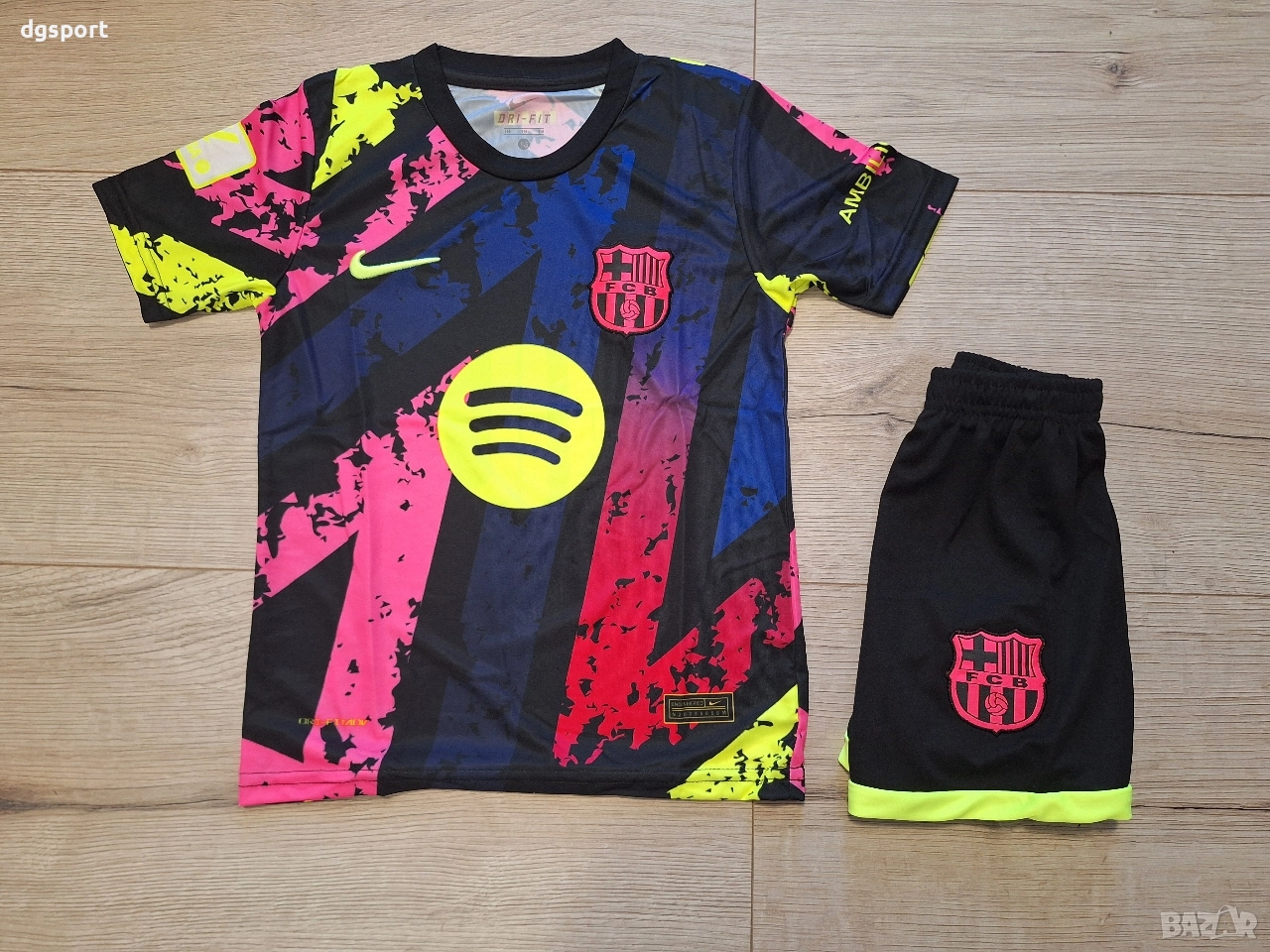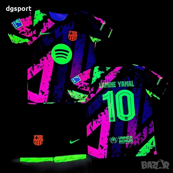 Детски флуоресцентен футболен екип на Барселона #ЛаминЯмал#10!Специално издание Ламин Ямал!Екипът е флуоресцентен под ултра виолетова светлина. Бродирани емблеми на клуба и марката.Име на футболист и номер принтирани директно върху плата.Налични размери 116,128,140,152,164 и 176.Доставка със Еконт или Спиди, опция преглед и тест.