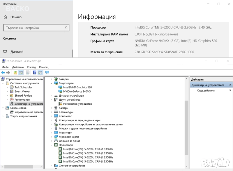 Хард диск: 256Gb SSD m2SATA. Прясно инсталиран лицензиран windows 10home интегриран в дъното (активира се автоматично след включване в мрежата).
