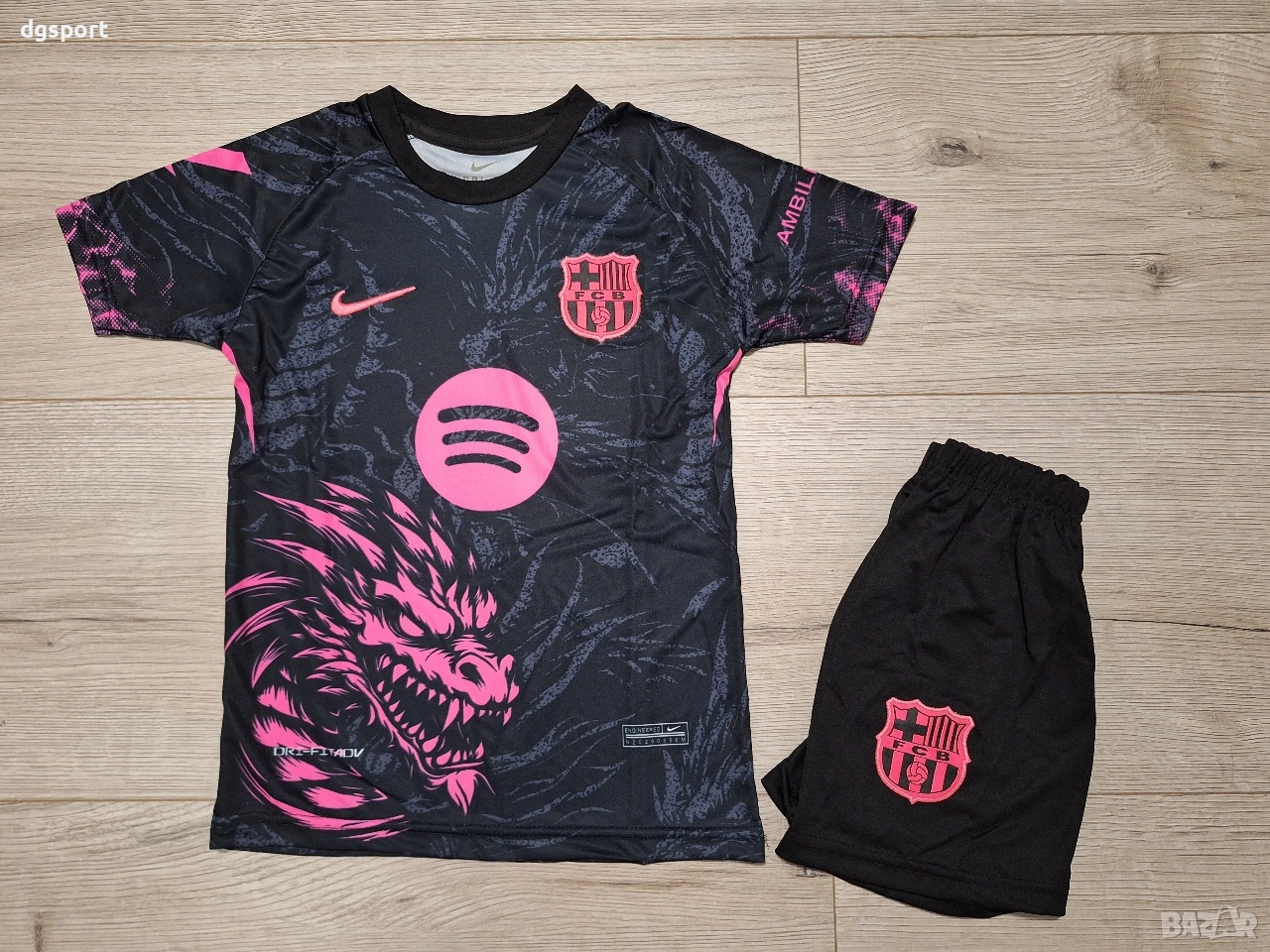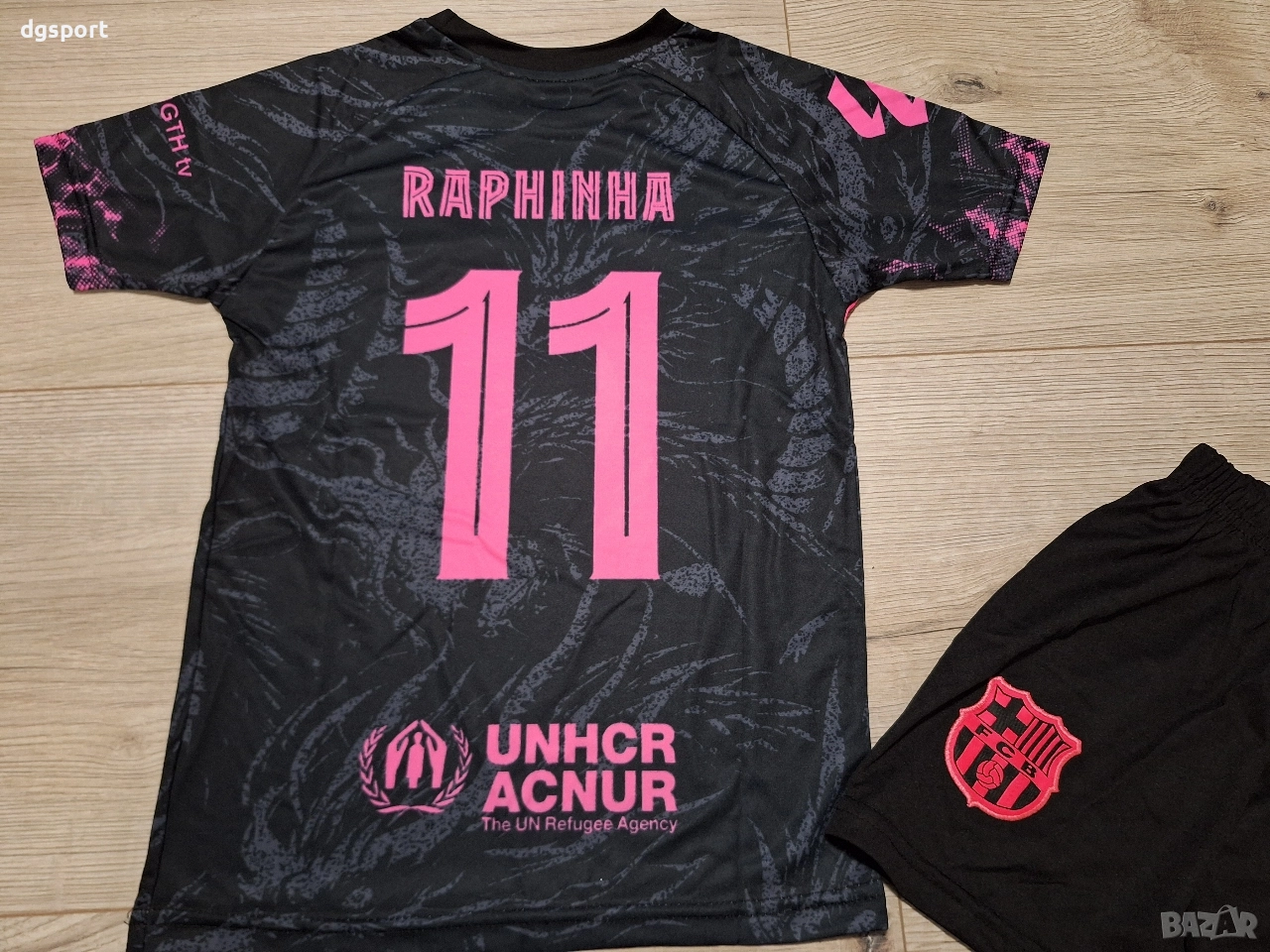 Детски флуоресцентен футболен екип на Рафиня Барселона !Специално издание Дракон!Екипът е флуоресцентен под ултра виолетова светлина. Бродирани емблеми на клуба и марката.Име на футболист и номер принтирани директно върху плата.Налични размери 116,128,140,152,164 и 176.Доставка със Еконт или Спиди, опция преглед и тест.