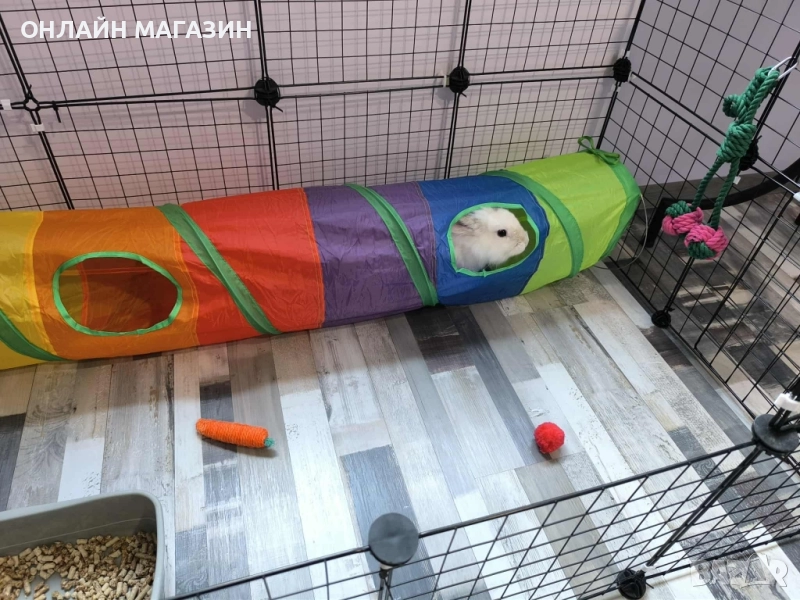 Допълнителният комплект съдържа: Дървено чукче, самозалепващи се гумени пулове против плъзгане и надраскване на пода, бели конектори с които да си направите вратичка, която да се отваря лесно или да се заключва лесно за да може домашния Ви любимец да излиза или да се прибира сам, и също така за по-лесно почистване на заграждението, свински опашки за по-сигурно и издръжливо захващане на отделните модули и подробни инструкции как да си сглобите клетката стъпка по стъпка.