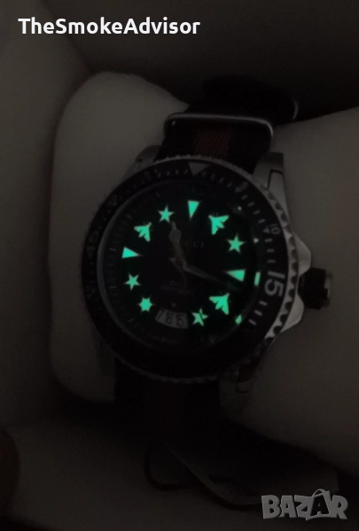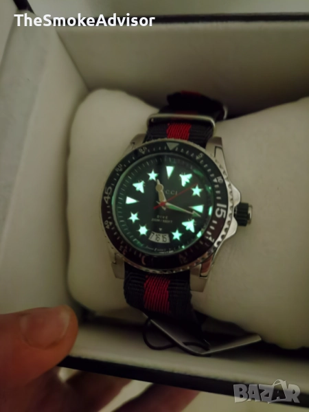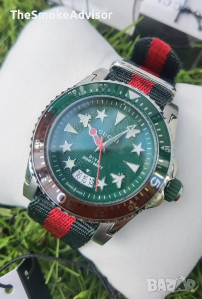 Създаден по образец на професионалните дайвърски часовници, този унисекс модел съчетава отличимата естетика на Gucci с ежедневна надеждност. Зеленият циферблат с многоиконни индекси и зелено-червеният безел дават силно присъствие на ръката, а рециклираният полиестерен Web каишка осигурява комфорт и устойчивост. Швейцарският кварцов механизъм осигурява безупречна точност, а луминесцентните индекси позволяват лесно отчитане дори при слаба светлина.