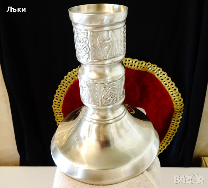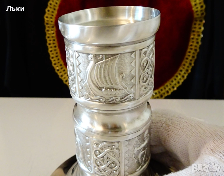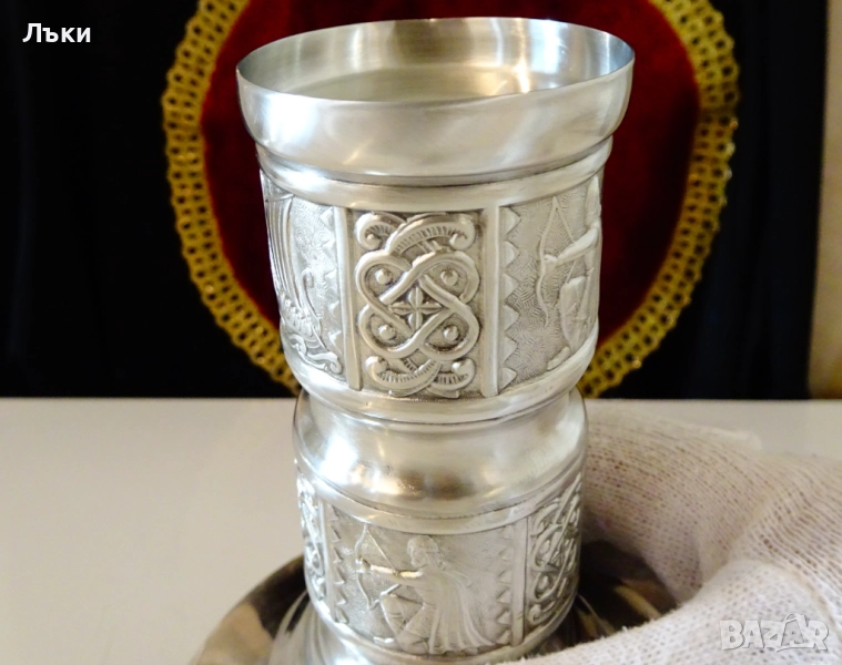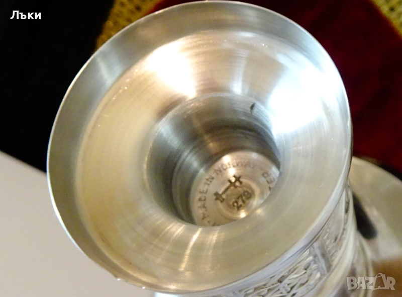 95% калай и 5% сребро,маркиран от производителя.Декориран с релефни
