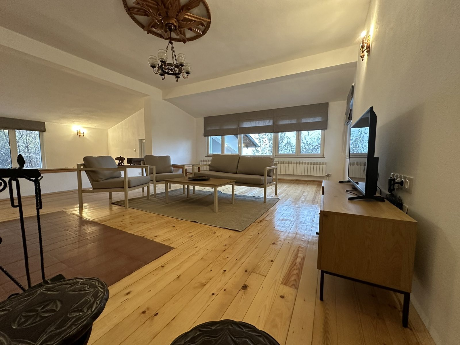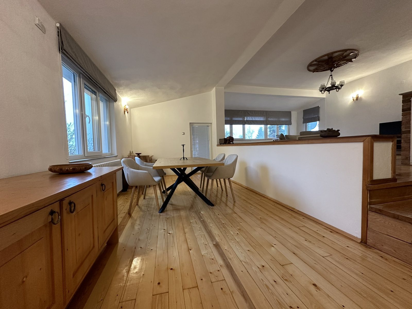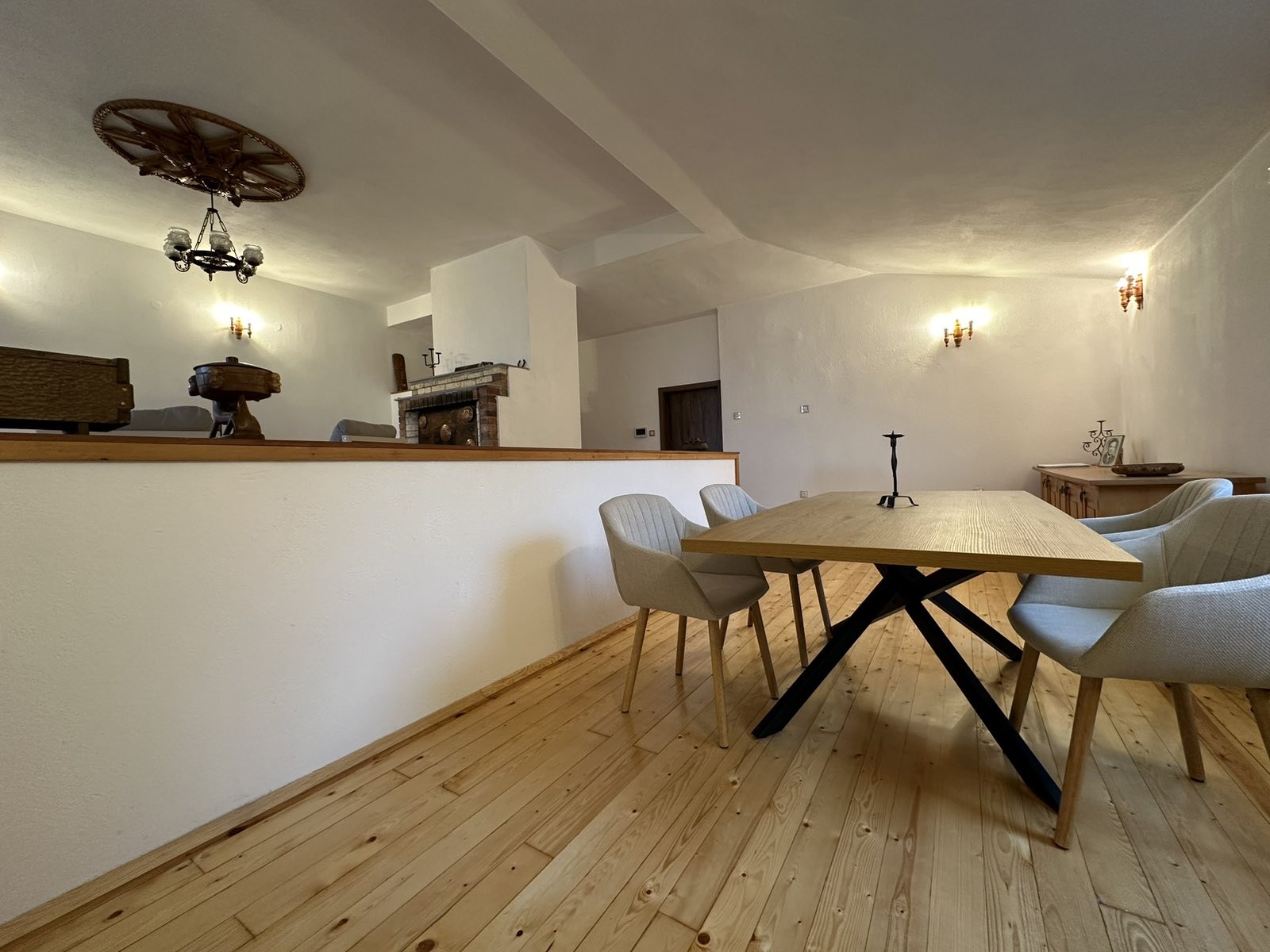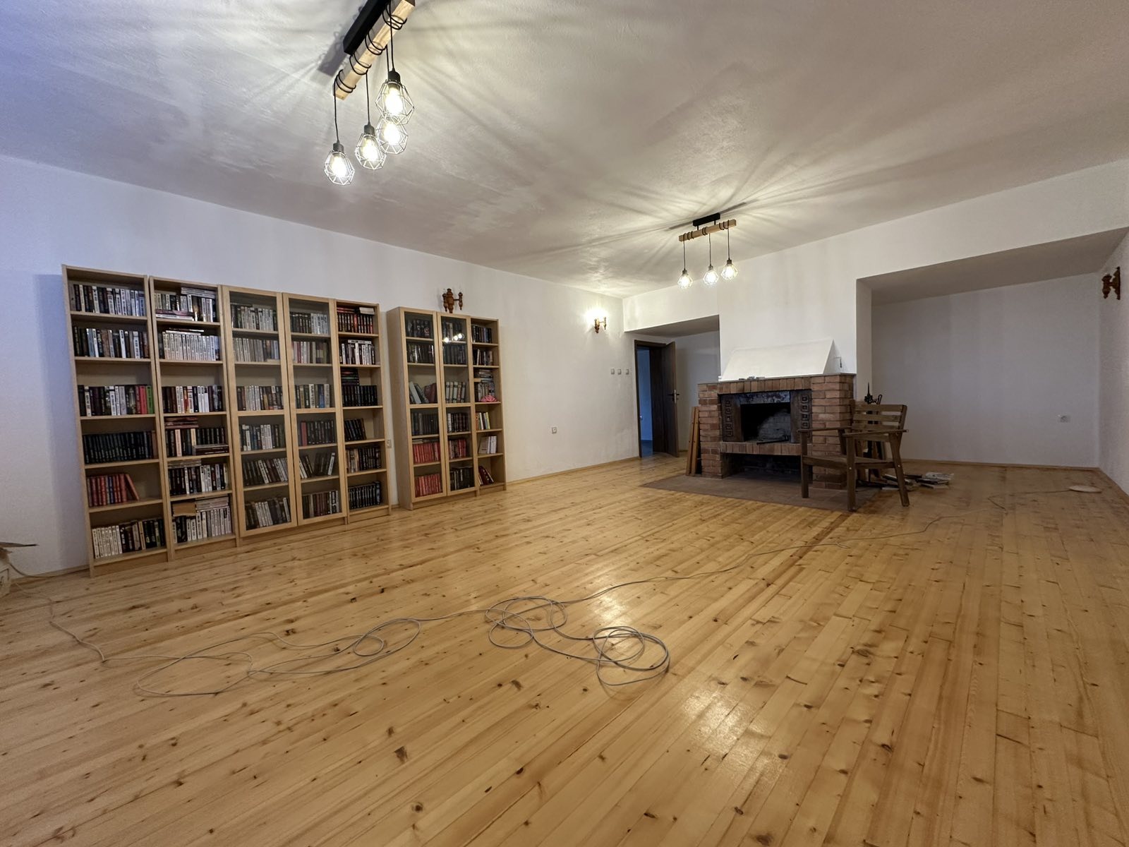 1 етаж (антре, голяма стая 45кв.м с камина, мокро помещение, тоалетна, котелно и мазе.