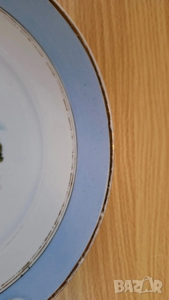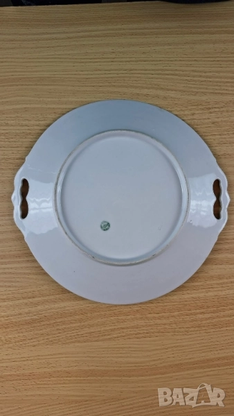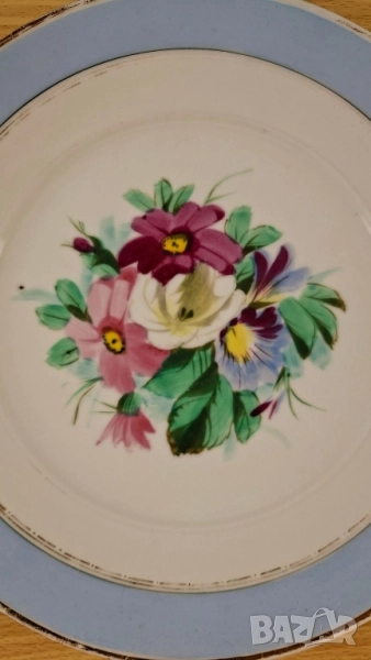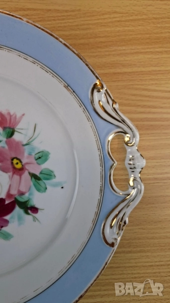 150 годишно порцеланово плато с дръжки, украсено с цветен букет в центъра, нежносин борд и позлатени орнаменти.