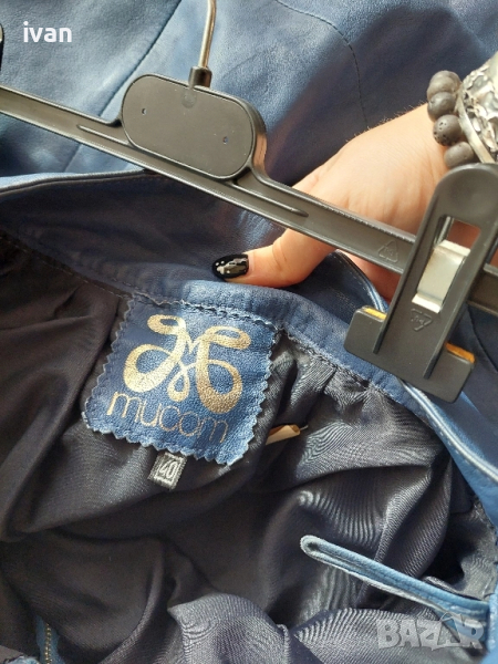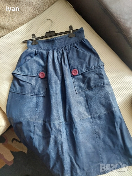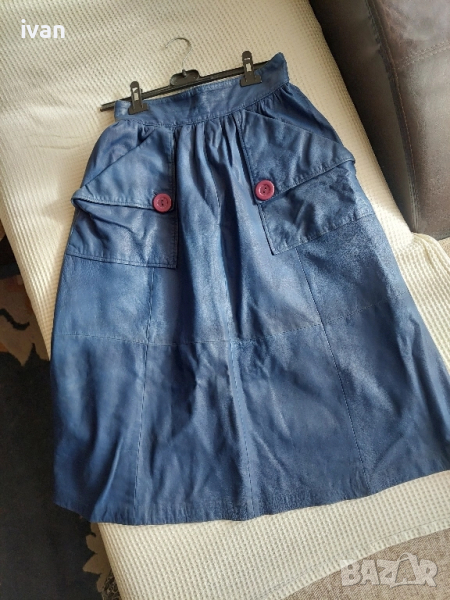 Синя дълга кожена пола, използвана но много добре запазена, с няколко пласта. Пише размер 40, но отговаря по-скоро на 36