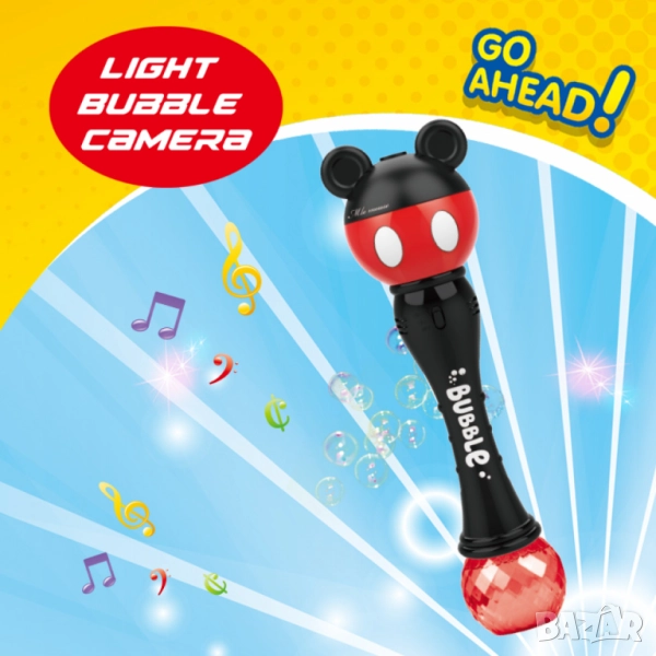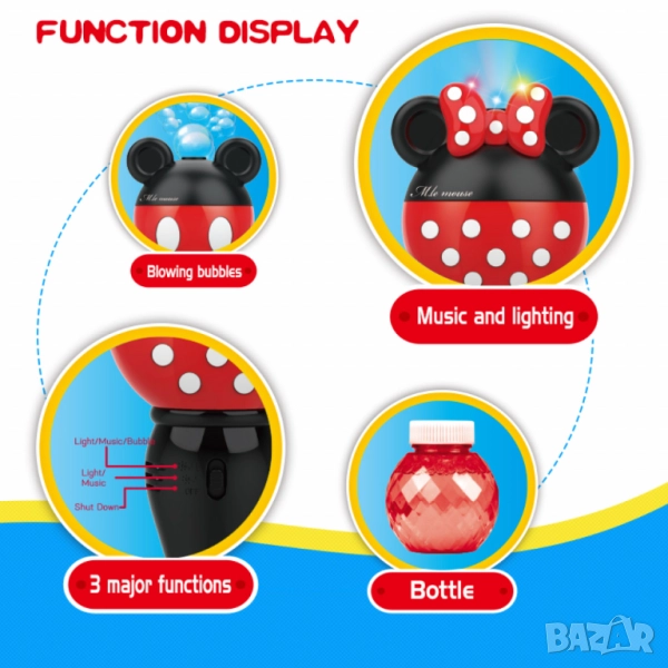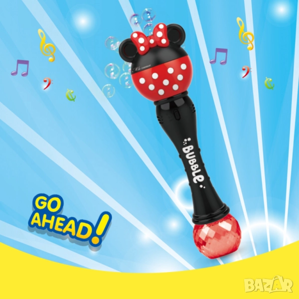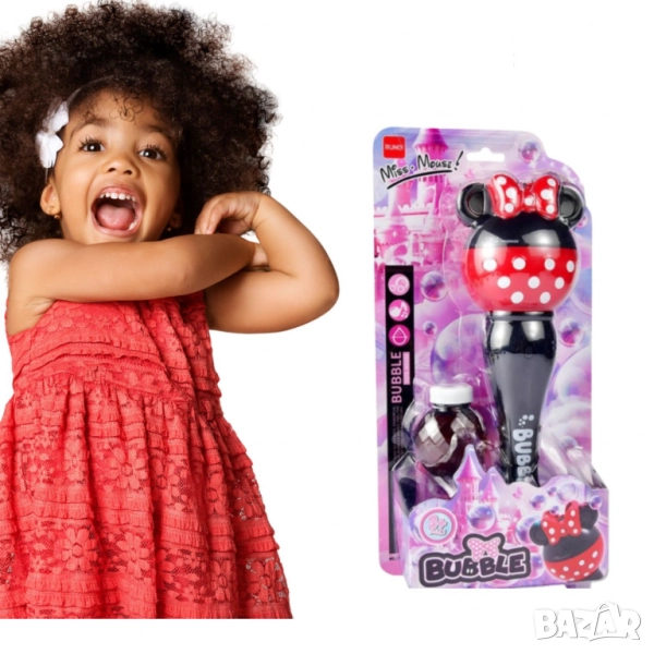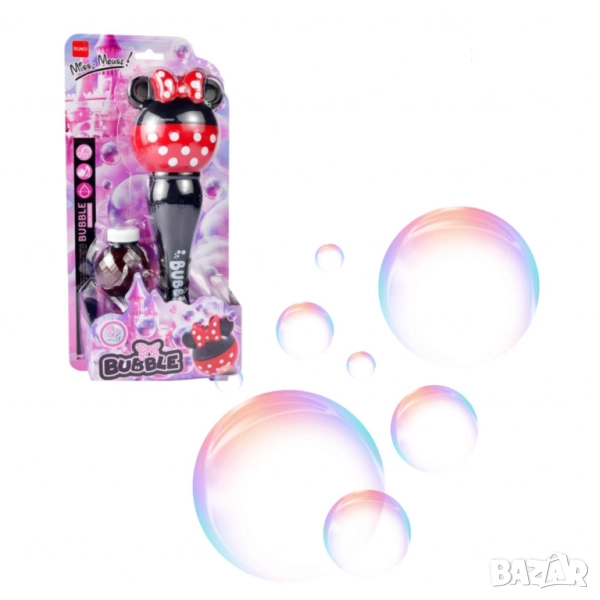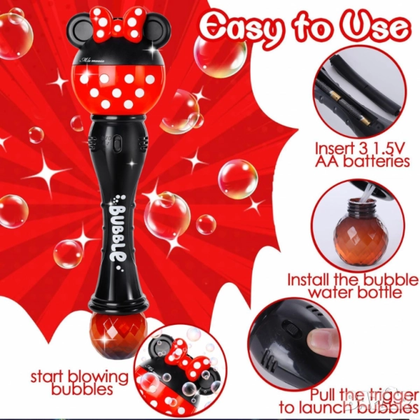 Детска играчка за сапунени балончета със забавен дизайн, вдъхновен от популярния анимационен герой Мини Маус. Създава множество сапунени балончета с едно натискане на бутон, придружени от светлинни ефекти и забавен звук. Идеална за игри на открито и закрито.