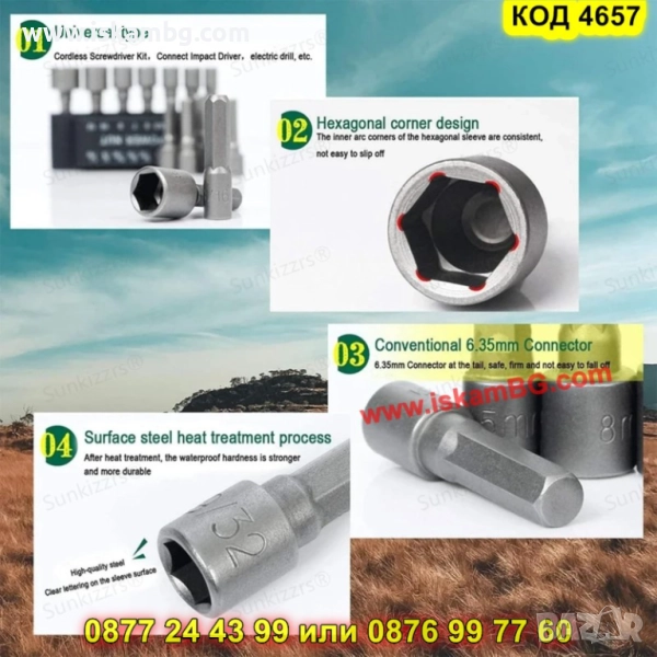 Стандартният 1/4" шестостенен захват (6.35 мм) е подходящ за всички електрически и акумулаторни винтоверти, бормашини и отвертки.