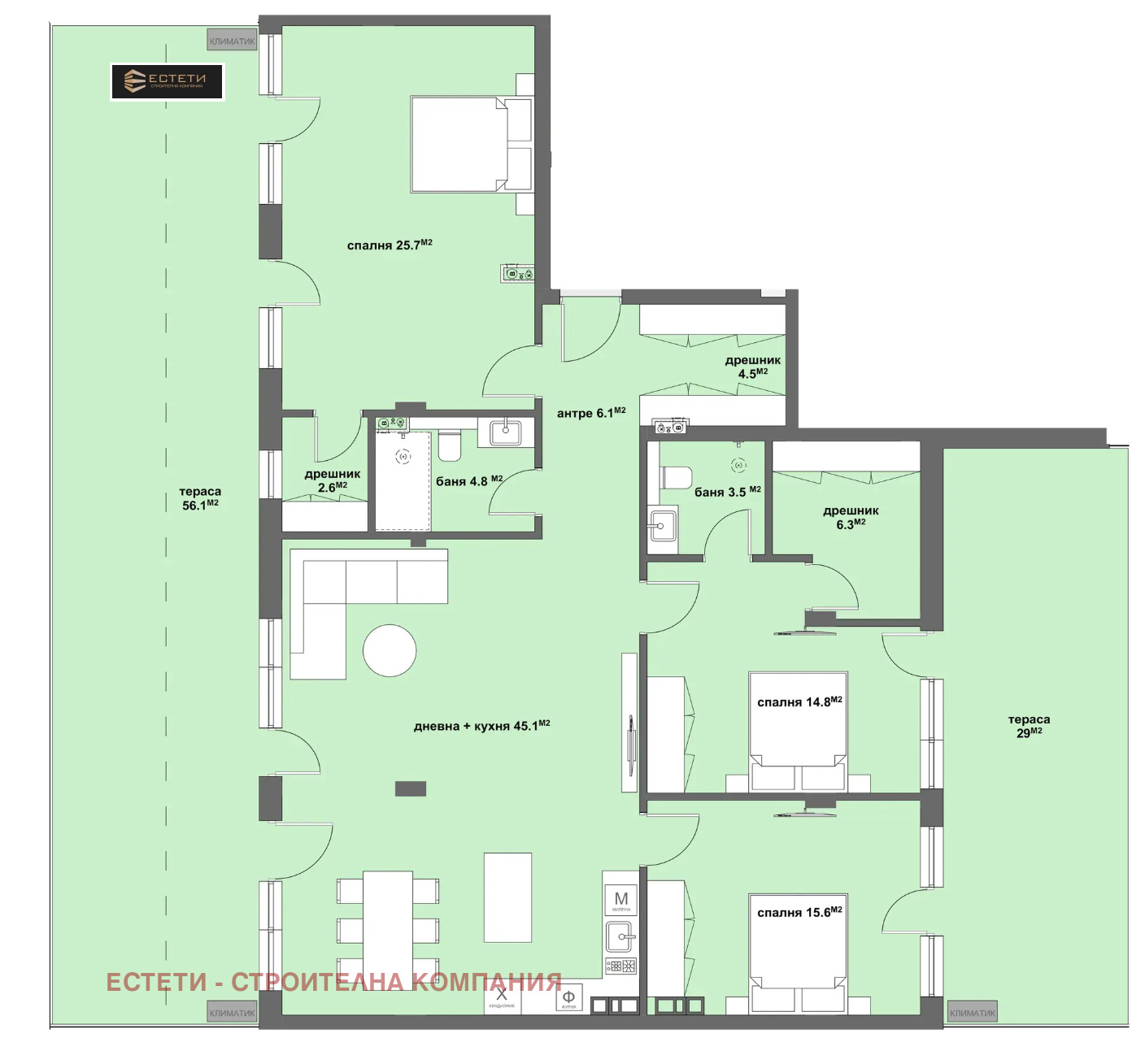 🏡 Пентхаус състоящ се от: антре, дневна с кухня, 3 спални, 2 бани с тоалетни, 3 дрешника, килер, просторни тераси. Квадратура - 299 кв.м.