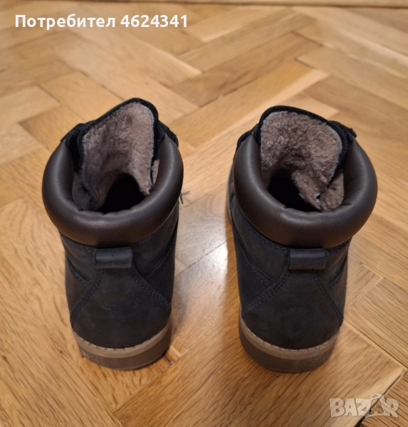 Материалът отвън е естествена омаслена кожа, устойчива на влага. Подплата е топла пухкава отвътре с вълнена стелка– подходяща за студено време. Подметката е гумирана, с добро сцепление.