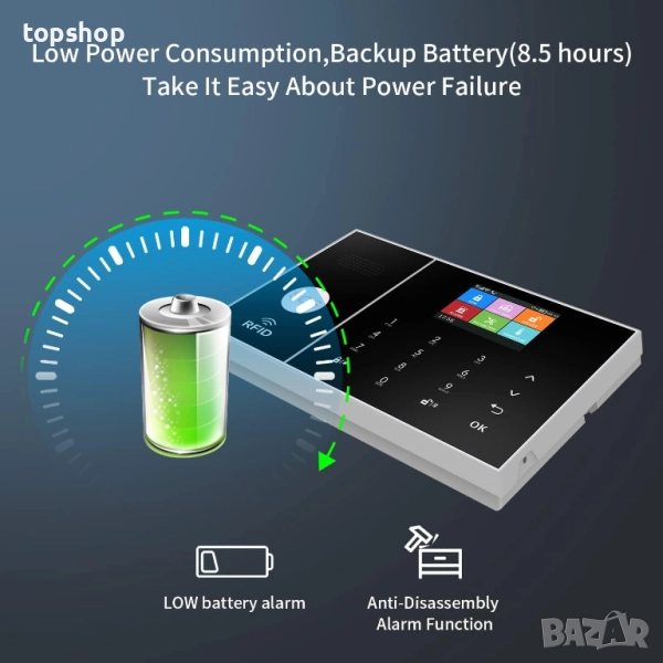 【WiFi +4G】: Домашната аларма поддържа Wi-Fi APP push мрежова аларма, SMS, гласово наблюдение, главна мрежа и други многоканални методи за аларма, за да се осигури стабилна и надеждна работа на алармата. До 100 контролера, RFID карти и безжични детектори разпознават местоположението на съхранение.