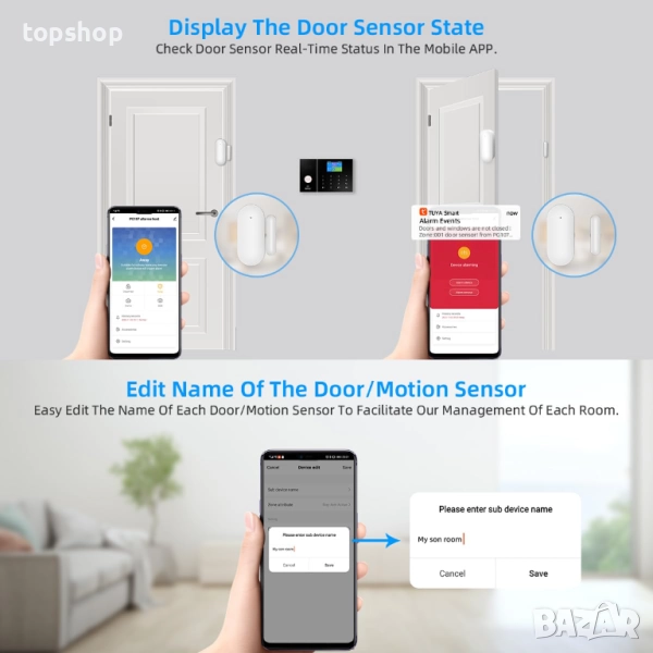 【Аларма, съвместима с Google, Alexa и Tuya】Комплектът за домашна аларма не разрушава декоративния стил на къщата и не уврежда стените; Вграден мощен 32-битов процесор, базиран на Cortex-M3, системата за домашна аларма поддържа дистанционно управление чрез Tuya APP и поддържа Amazon Anti-theft Alexa, Google Assistant за гласово управление.