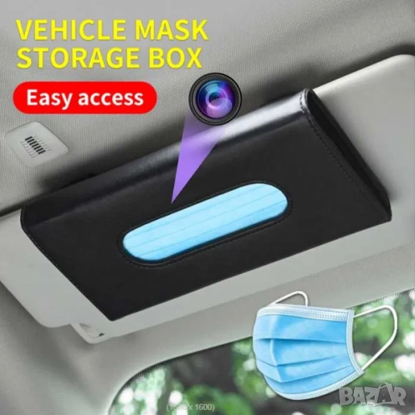 Поставка за носна кърпа - шпионска скрита камера в кола + FULL HD 1080P + детекция на движение + Wifi (Android и iOS). Широкоъгълният обектив на камерата с ъгъл на видимост 90° е незабележимо камуфлиран в черен държач за носна кърпа за автомобили. Камерата се захранва от акумулаторна батерия, която се зарежда чрез микро USB кабел. Камерата се управлява чрез безплатно мобилно приложение, което е съвместимо с Android и iOS. Поставката е напълно функционална, в нея можете да поставите носни кърпички, маски за лице и да поставите държача в колата върху сенника.