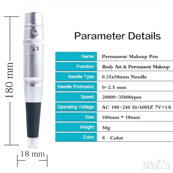 Тази писалка за татуиране е предназначена за татуировка на вежди, очна линия и устни. Материалът от алуминиева сплав с неръждаема стомана вътре е стабилен. Ниският шум, автоматичният дизайн на заключващата игла и високата скорост на въртене са идеални за работа.