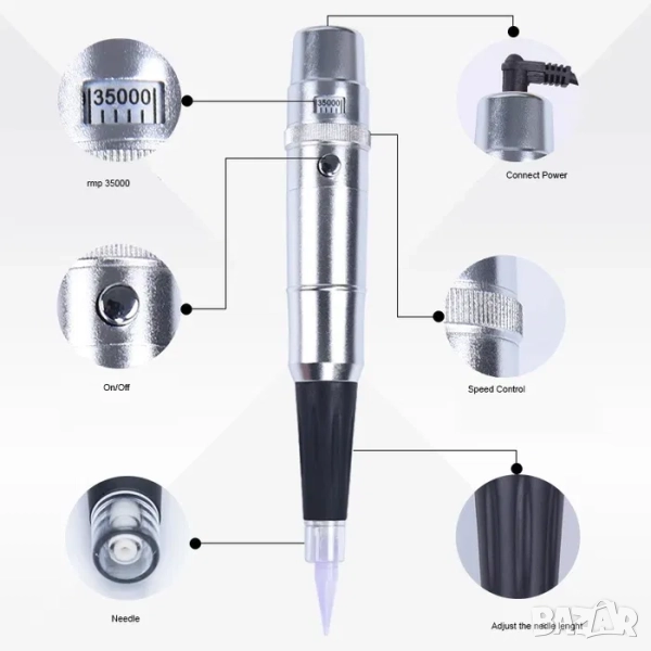 Професионална писалка за перманентен грим вежди и устни. Машина за косъм по косъм. Скала с цифри за намаляване и увеличаване на оборотите.