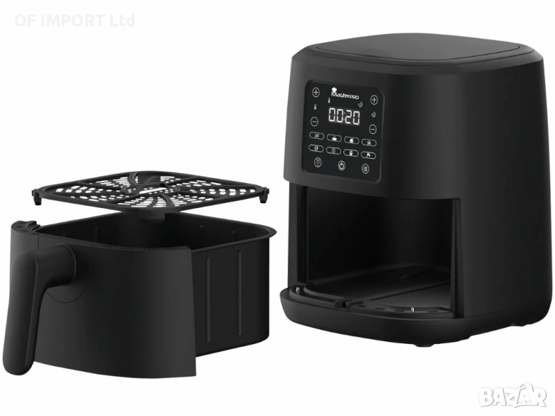 8 програми: пържене на въздух, печене, грил, затопляне, поддържане на топлина, пържени картофи, птиче месо 1 нагревателен елемент от неръждаема стомана, комбиниран с вентилатор Тефлонова повърхност MAX маркировка от вътрешната страна на двете кошници Сензорен екран с бели цифри на черен фон Противоплъзгащи крачета Защита от прегряване Кошницата и решетката могат да се мият в съдомиялна машина Технически данни Мощност: 1500 W Температурен диапазон: 80 - 205 °C Обем: 4 л / използваем обем: 3,5 л Размери приблизително 24 x 32 x 30 см Тегло приблизително 3,73 кг