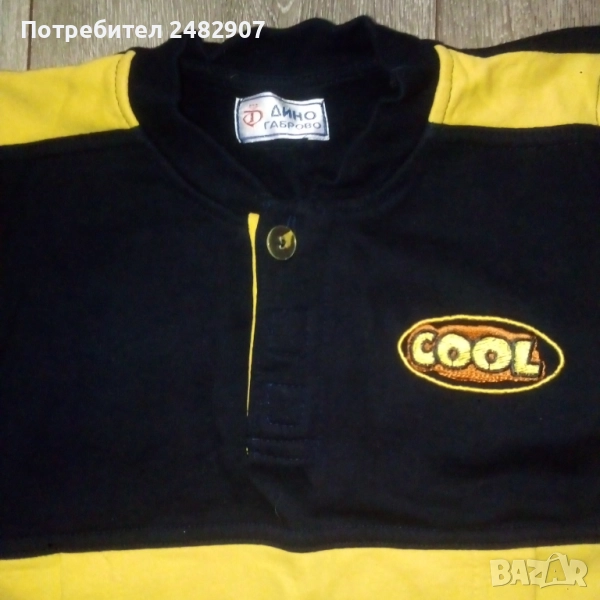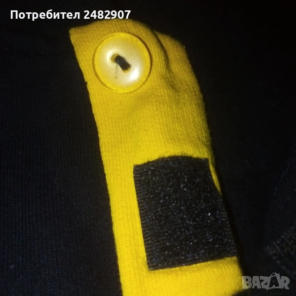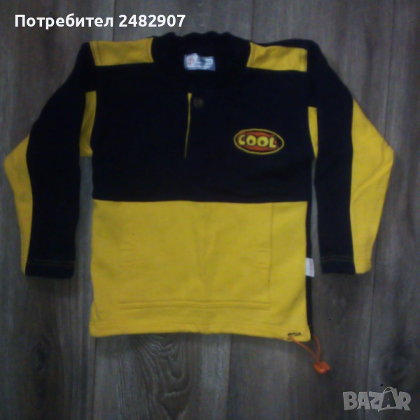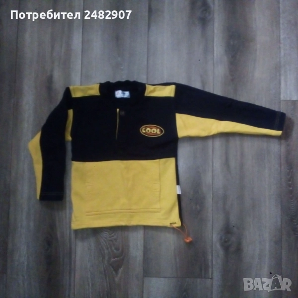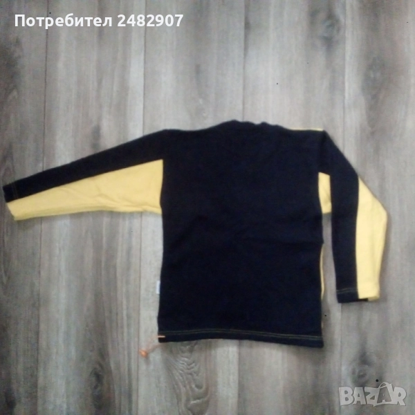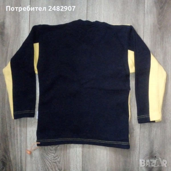 Ватирана детска блуза в тъмно синьо и жълто, 100 % памук за възраст 4-5 годинки. Ширина в раменете - 30 см, ширина под мишниците - 33 см, ширина в долната част - 33 см, дължина от рамото до долу - 42 см, дължина на ръкава от рамото - 33 см, ширина на ръкава в долната част - 8,5 см. Много запазена, почти не е използвана, без забележки.