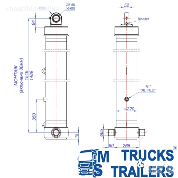 За монтирането на този Хидравличен цилиндър са необходими допълнителни елементи, които се заплащат отделно.
