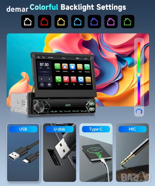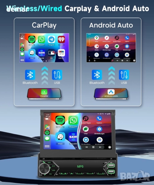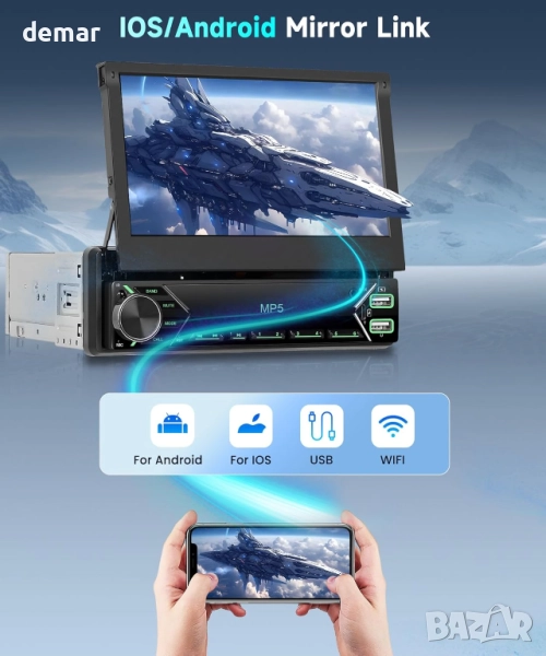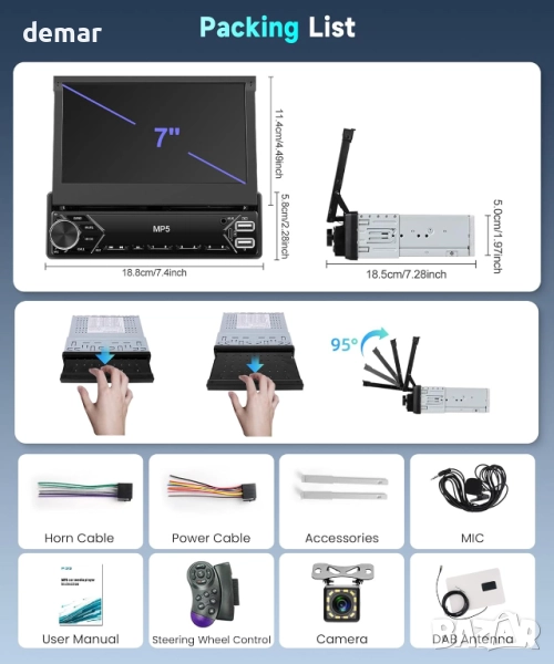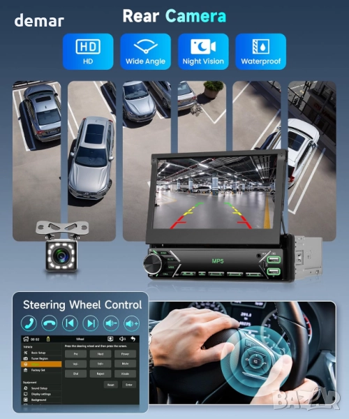 Това еднодиново автомобилно радио разполага със 7-инчов ръчно разгъващ се сензорен екран с регулируем наклон, ярка резолюция и персонализируеми цветове на подсветката, които да съответстват на интериора на вашия автомобил. Поддържа DAB/DAB+/FM радио, Bluetooth 5.0 за ясни разговори със свободни ръце и безжичен CarPlay и Android Auto за лесен достъп до карти, музика и съобщения чрез гласово управление. Mirror Link позволява споделяне на екрана на смартфон, а 6-лентовият еквалайзер ви позволява да настройвате фино звука според вашите предпочитания. Съвместимостта с управлението от волана осигурява безопасна и удобна работа, а включената HD водоустойчива задна камера с нощно виждане осигурява ясна помощ при движение на заден ход при всякакви метеорологични условия.