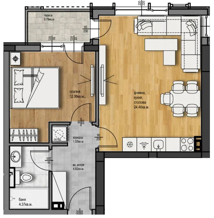 Едно от жилищата, което ви предлагаме е ДВУСТАЙНО С ИЗЛОЖЕНИЕ: ИЗТОК, което разполага с дневна с кухненски бокс и трапезария- 24,40 кв.м, самостоятелна спалня- 12,06 кв.м, входно антре, складово помещение, баня с wc, тераса. Обща площ 70,29 кв.м.