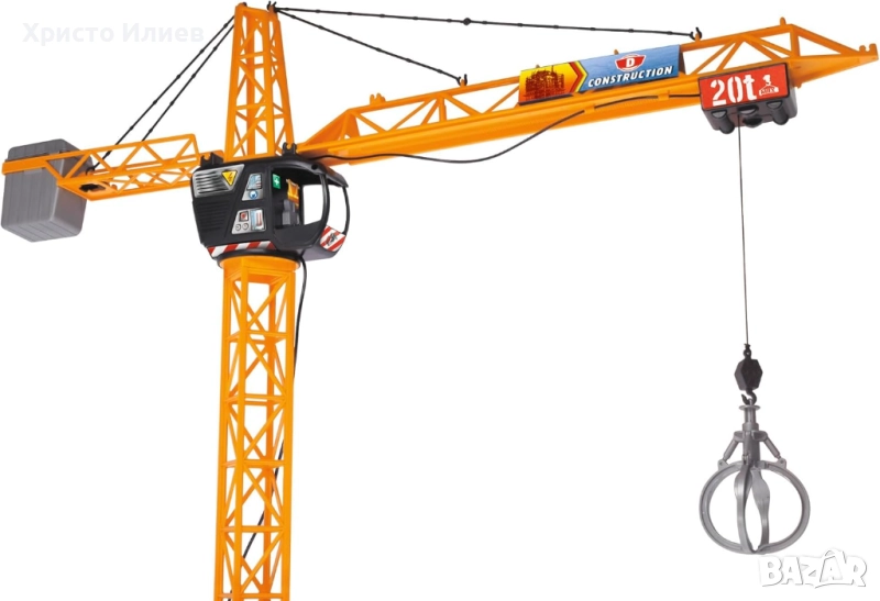 - Повече подробности: Включва захващащо рамо, товарна решетка, лебедка, количка за кран, отворена кабина (място за фигурки играчки 7,6 см). Въртене на 350°, електронно с 6 батерии AA LR06 (не са включени).