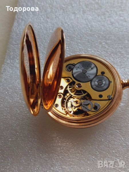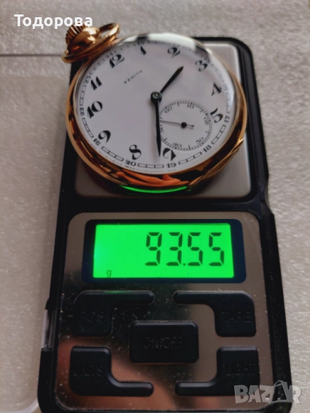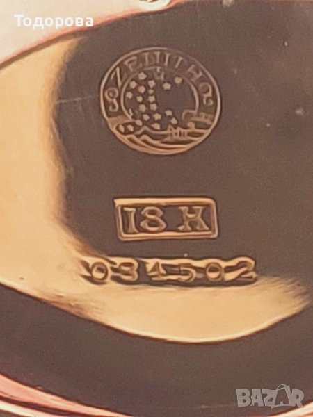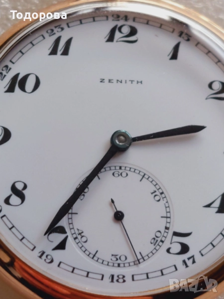 Предлагам за продажба джобен златен 18 каратов часовник марка Зенит. Произведен през 1904 г.порцеланов циферблат,жълта машина,всичко блести, без никакви забележки, отлично състояние.Въпреки своите 120 години изглежда като нов Специално инвеститорите на злато информирам ,че има 42гр. осемнадесет каратово злато.Часовникът освен като антикварна ценност, може да бъде и инвестиционна такава.Цената е променена поради постояното увеличение на цаната на златото.